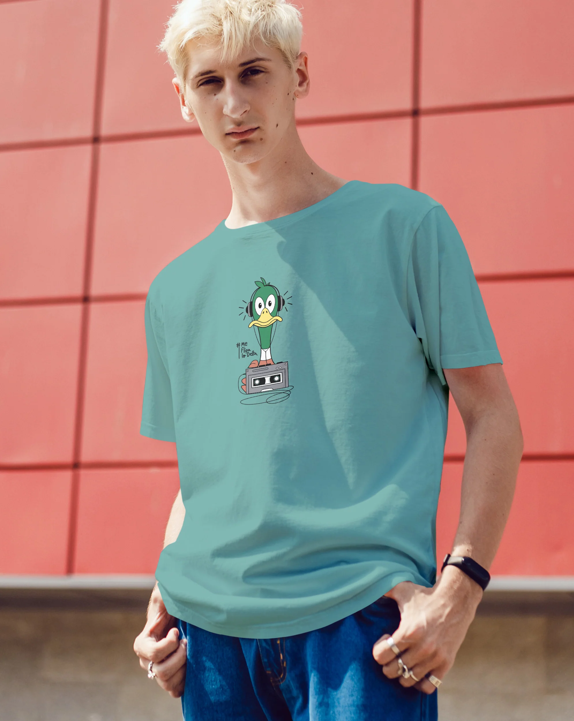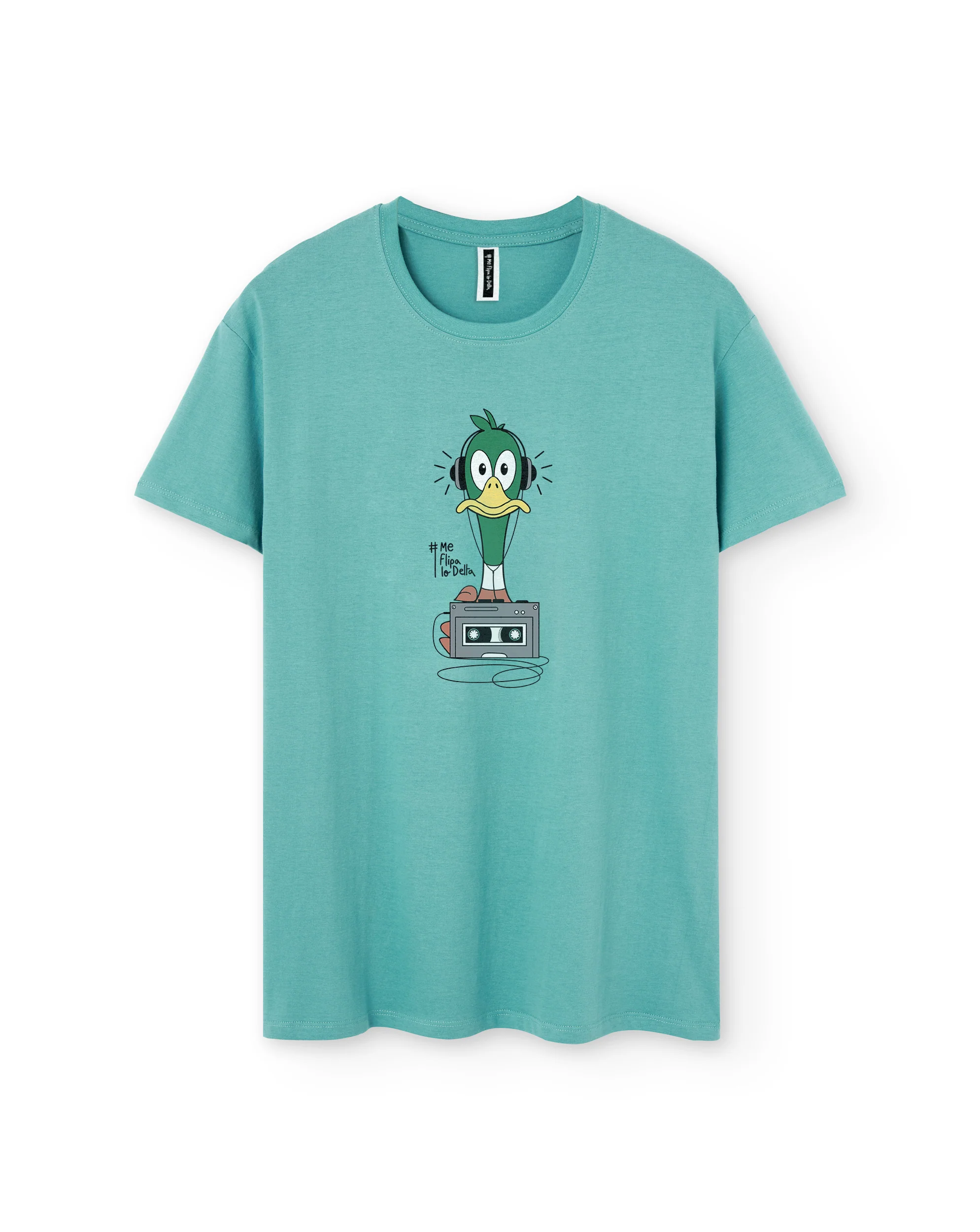Camiseta de manga corta unisex Me Flipa lo Delta en color verde agua con estampado en pecho pato DJ. Todos tenemos algún amigo DJ amante del pato. Disponible en las tallas de S a la XXL