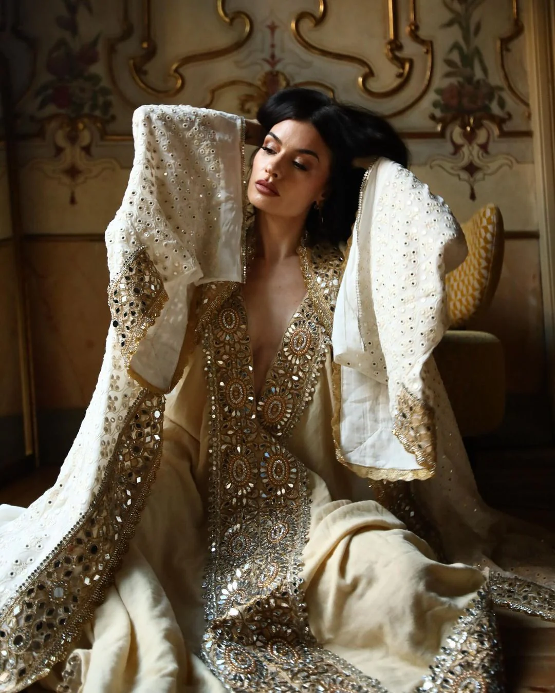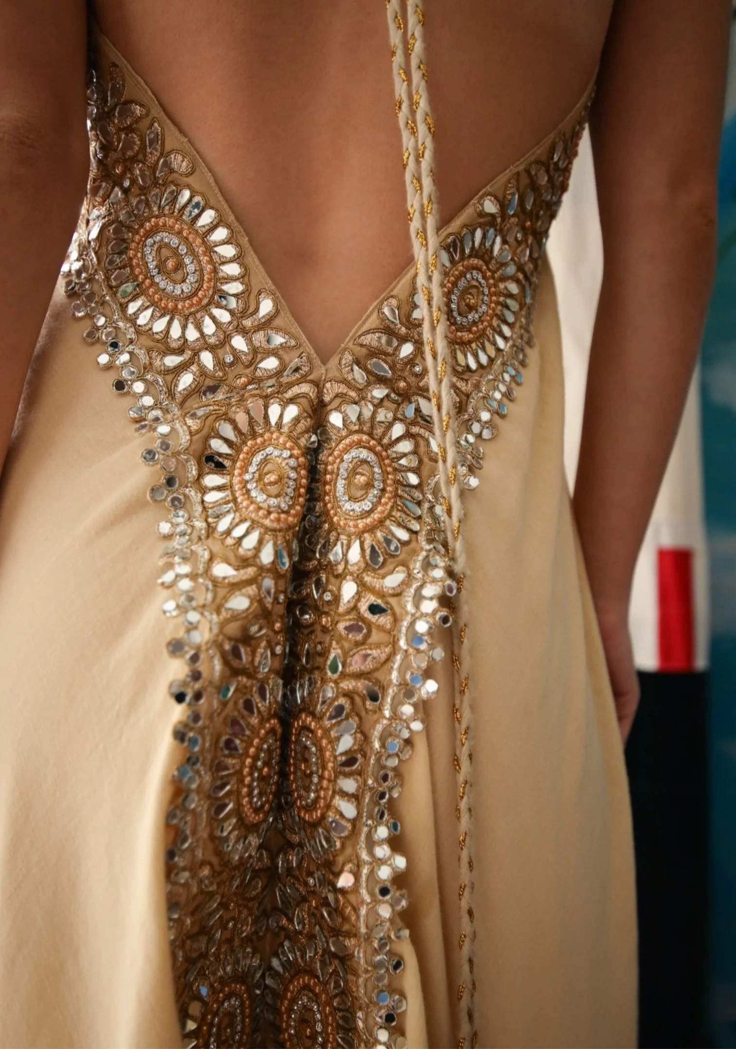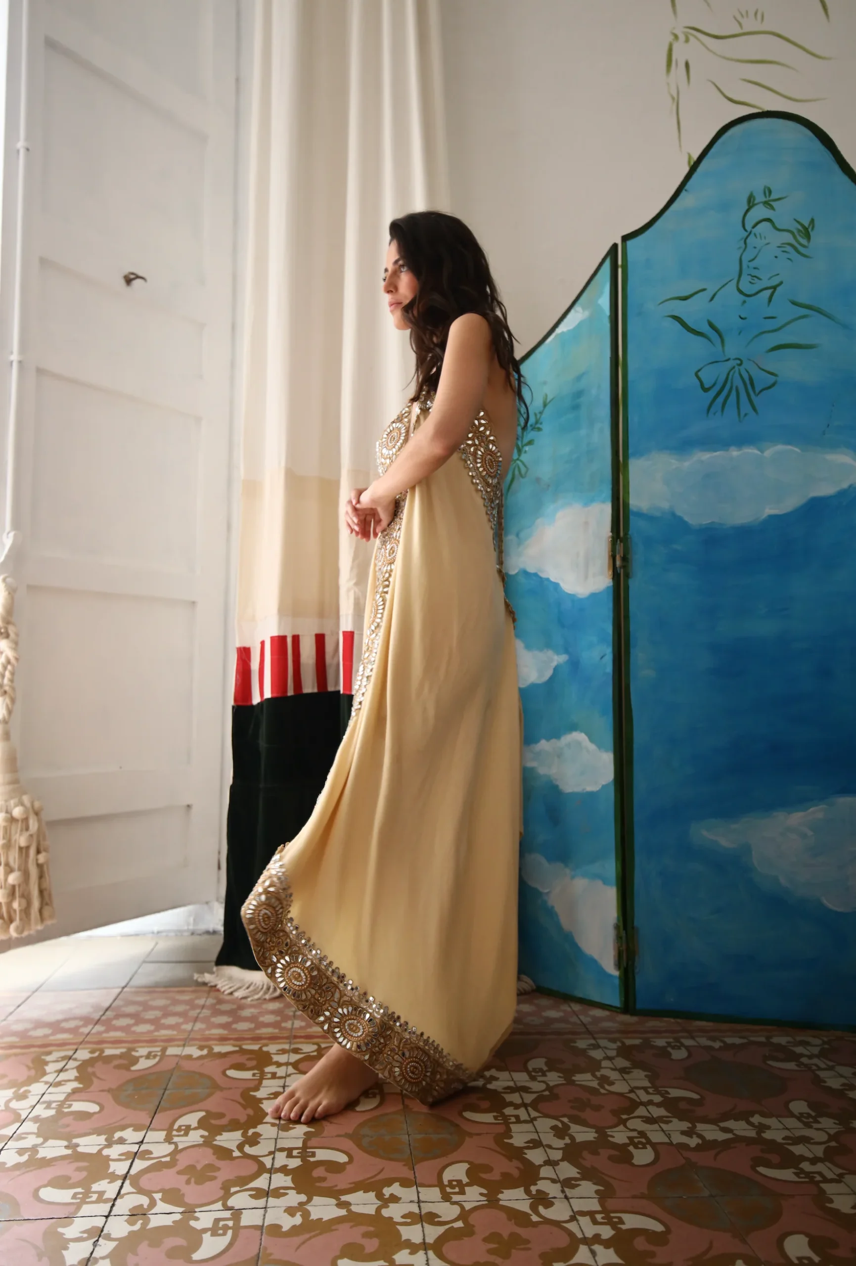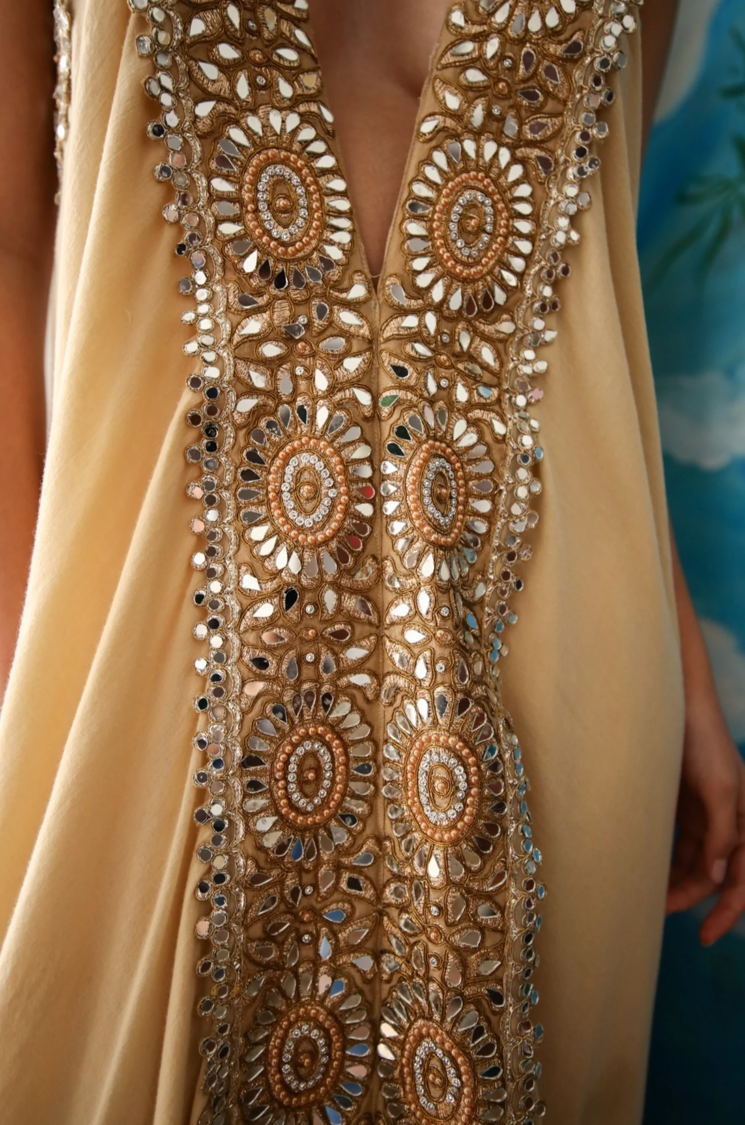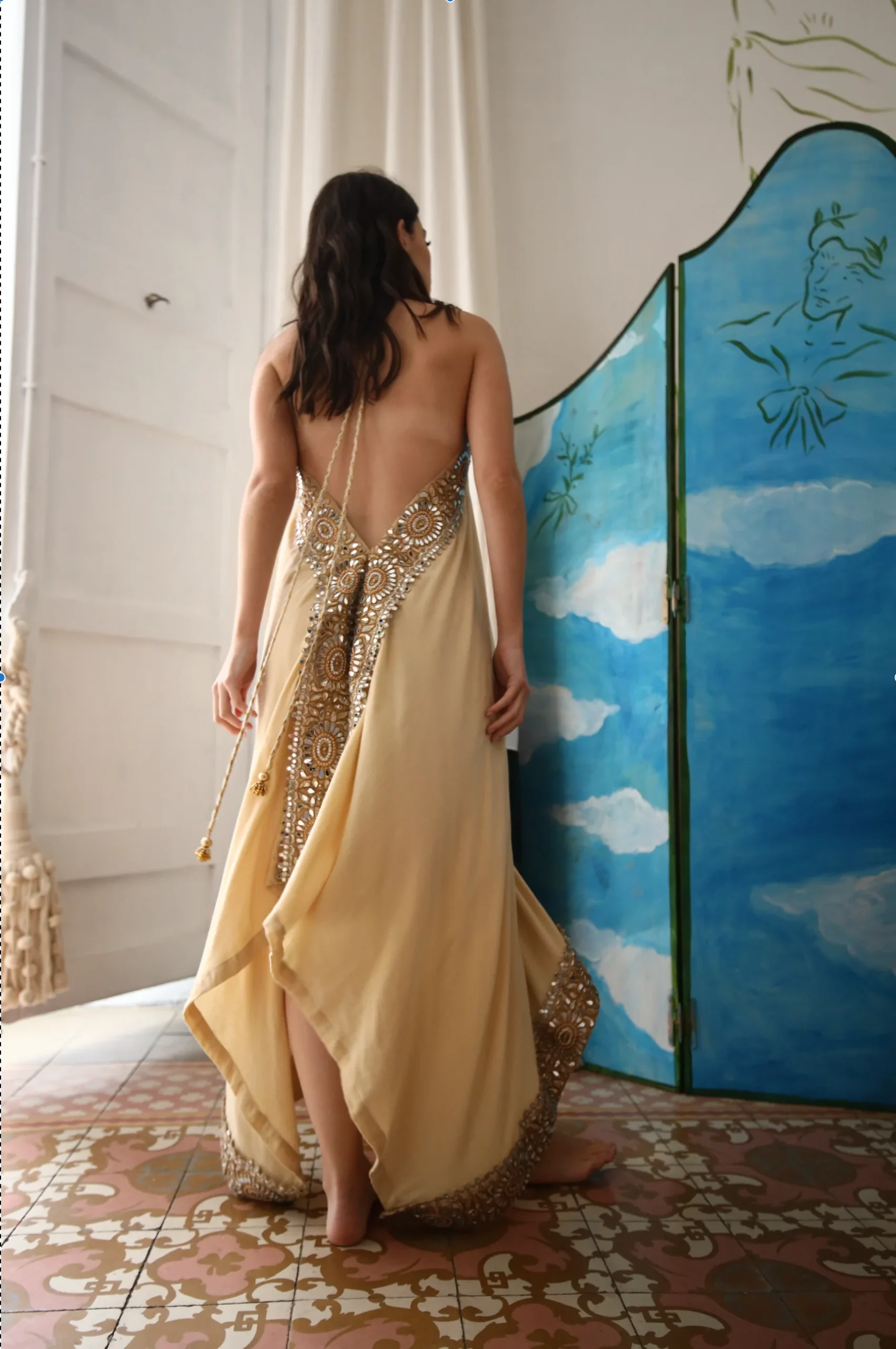 Vestido Bordado étnicos y espalda descubierta. Este vestido es una obra maestra de diseño y artesanía. Confeccionado a mano en un suave tejido de tono crema, presenta un escote profundo en V y una espalda descubierta que acentúan la siltueta femenina. Los intrincados bordados dorados y plateados adornan el escote creando un efecto visual impresionante que captura la luz. Talla Única