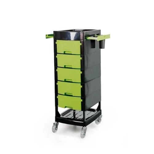 El Carrito Auxiliar Ania está fabricado en plástico resistente con ruedecillas de goma silenciosas de gran calidad para un desplazamiento óptimo (anti-cabellos), 5 cajones extraíbles, bandeja superior con compartimentos y soporte para secador. En colores verde, negro y lila.