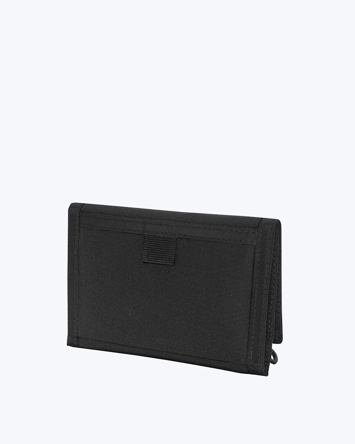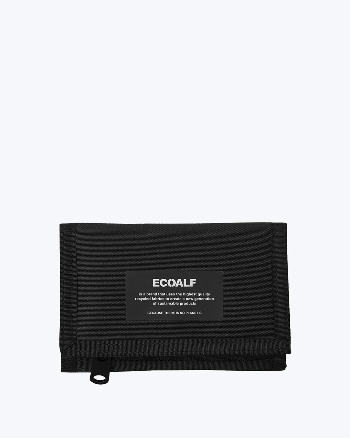 Cartera de la marca Ecoalf, en color negro, con compartimentos en el interior.