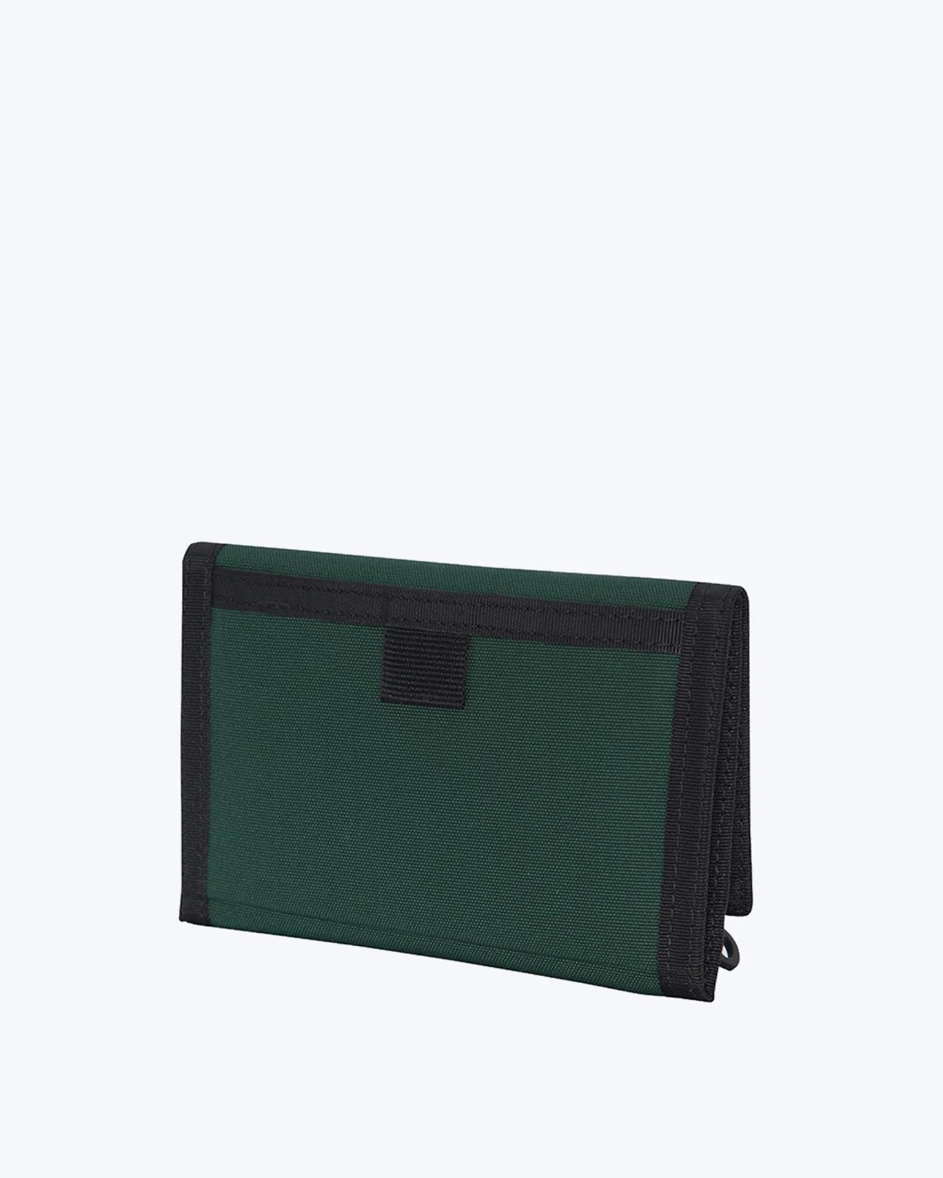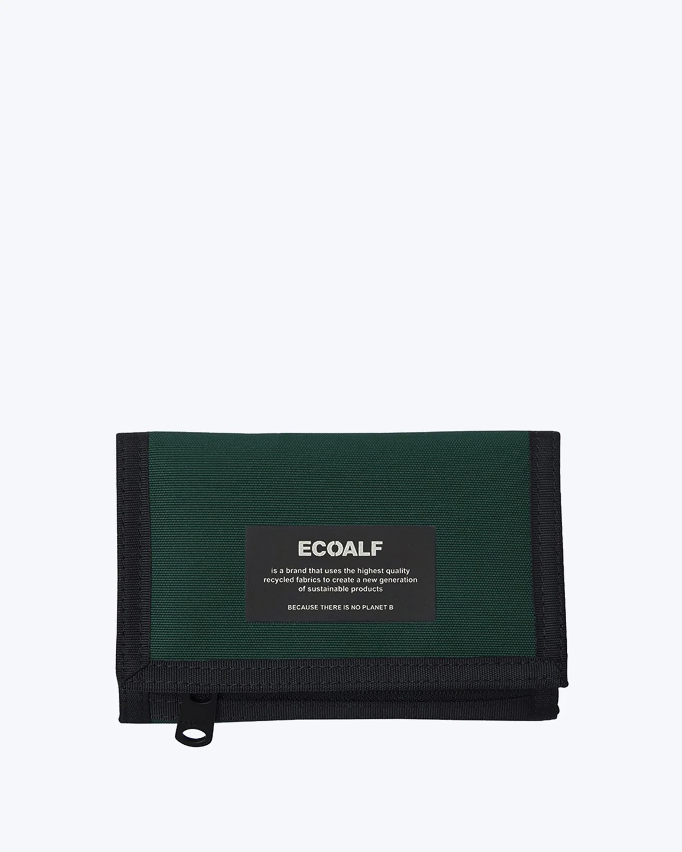 Cartera de la marca Ecoalf, en color verde, con compartimentos en el interior.