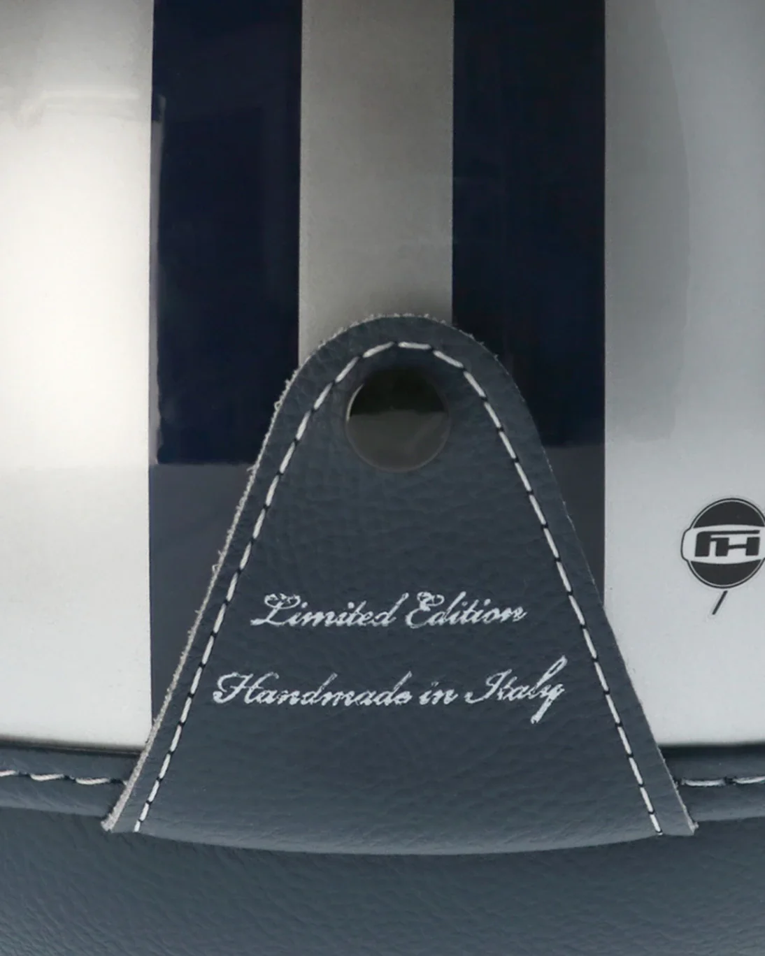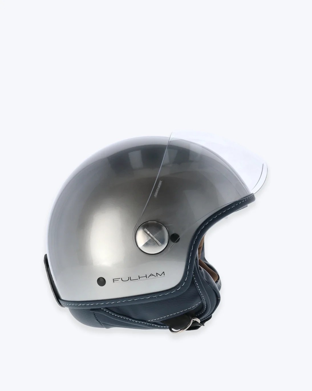 Casco de la marca FH Italia fabricado exclusivamente para Fulham, en color gris con dos franjas en azul.