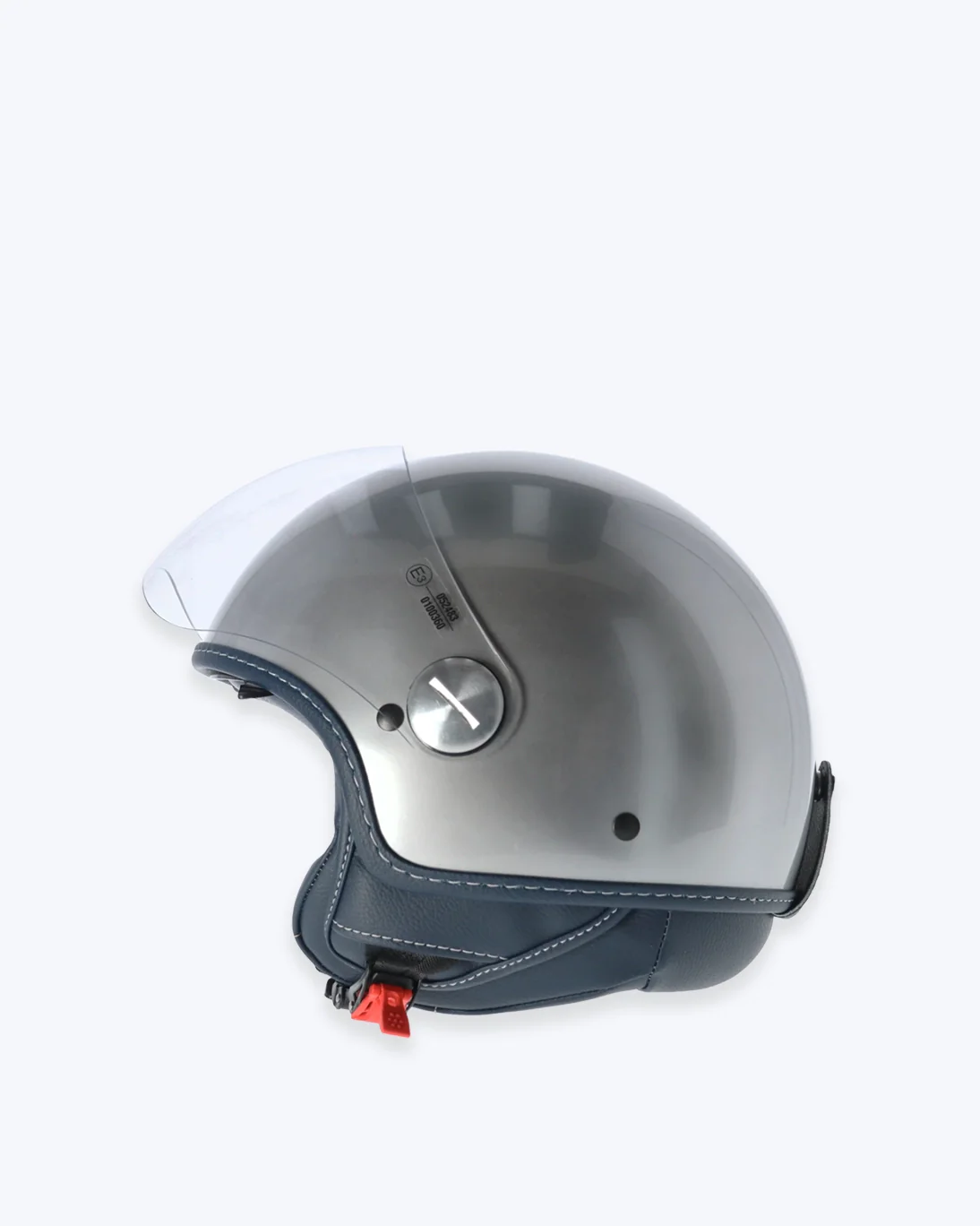Presenta acabados de piel en color azul y el interior beige. El cierre es ajustable y tiene una almohadilla a la altura de la barbilla para evitar rozaduras con la correa.