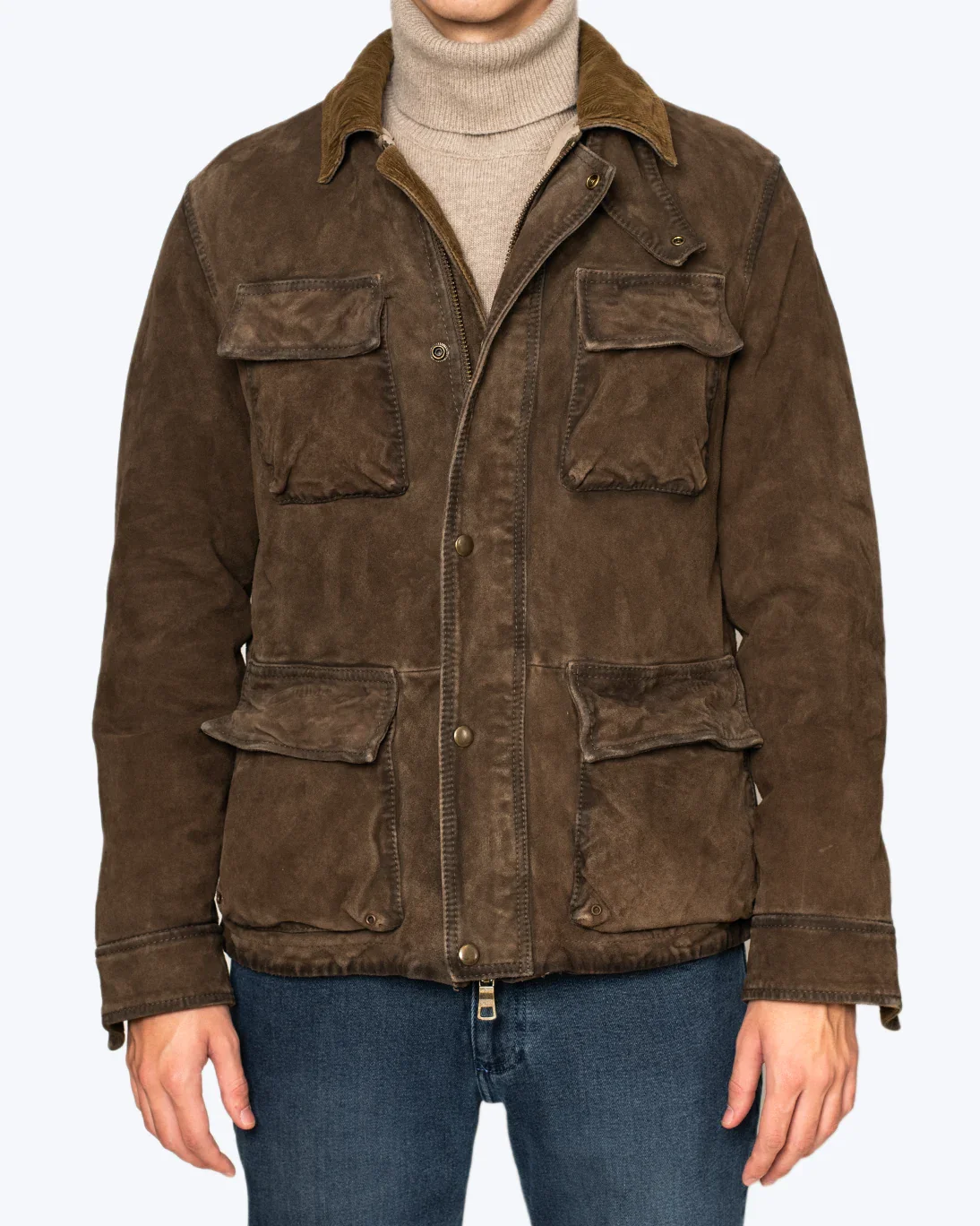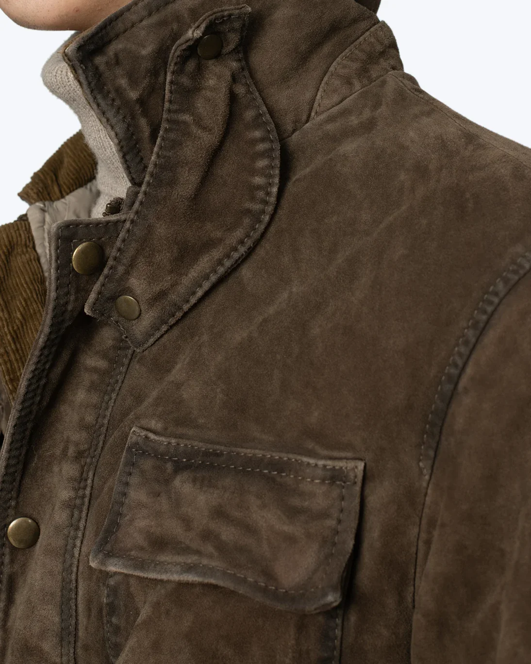 Cazadora de piel color verde alga con detalle de cuello de pana, de la marca The Jack Leathers,