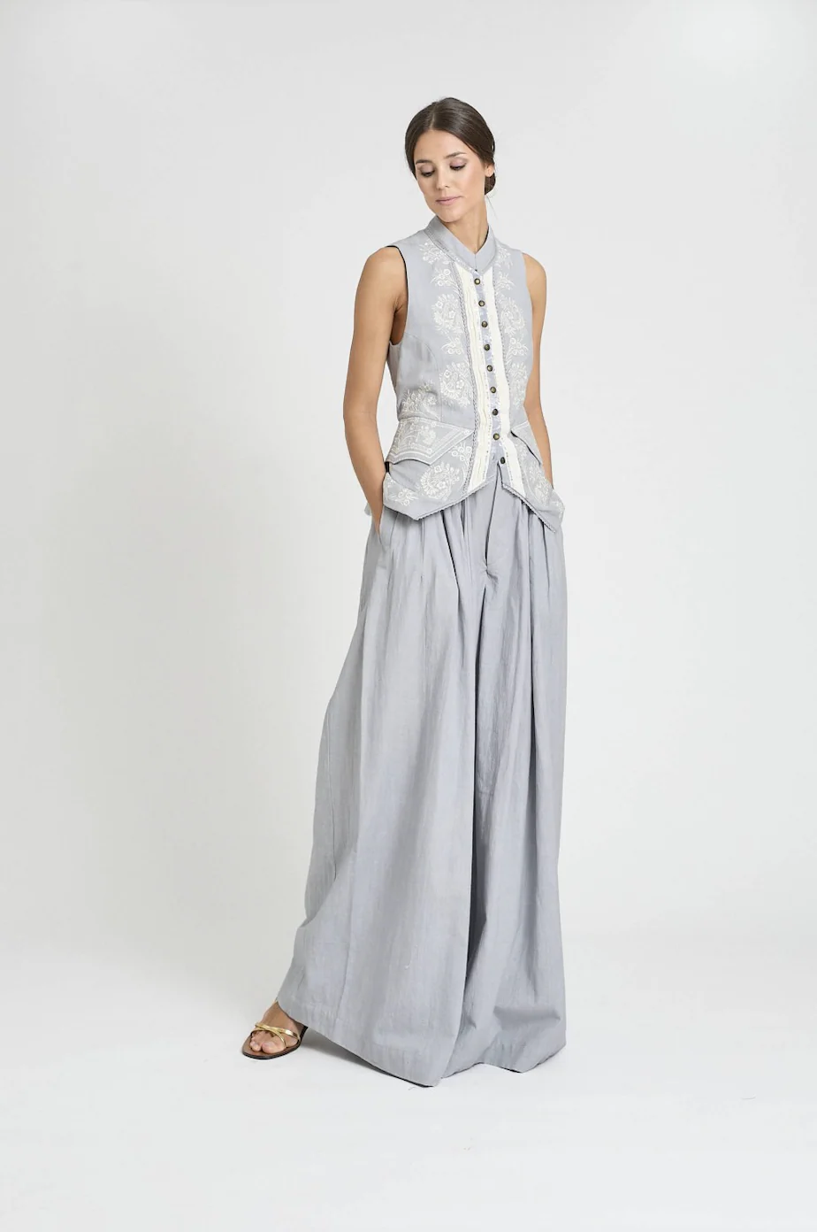 Chaleco de algodón, cuello mao, botonadura delantera y bordados en color crudo