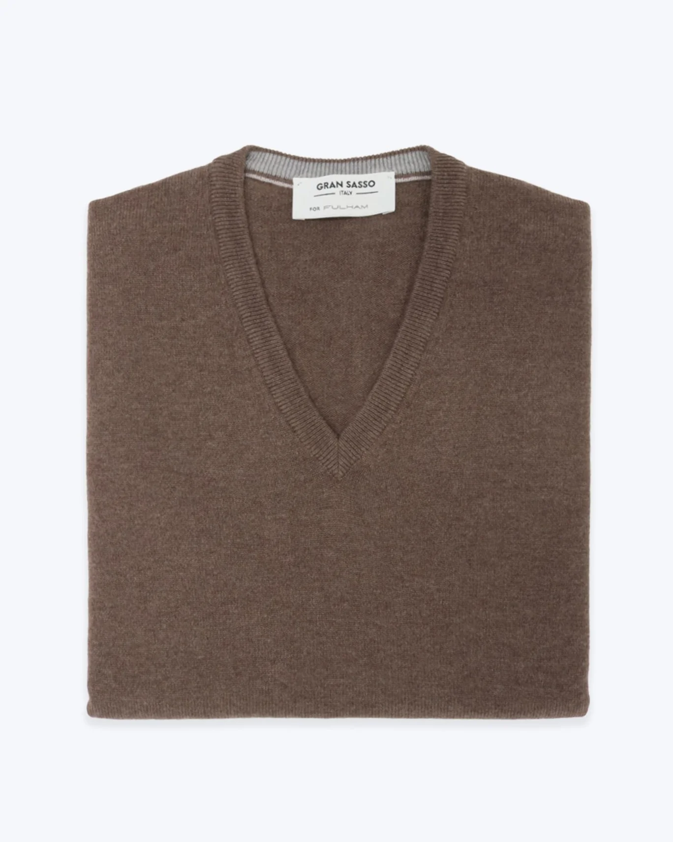 Chaleco de punto, con el cuello pico, de la marca Gran Sasso fabricado exclusivamente para Fulham, en color marrón. Presenta acabados acanalados.