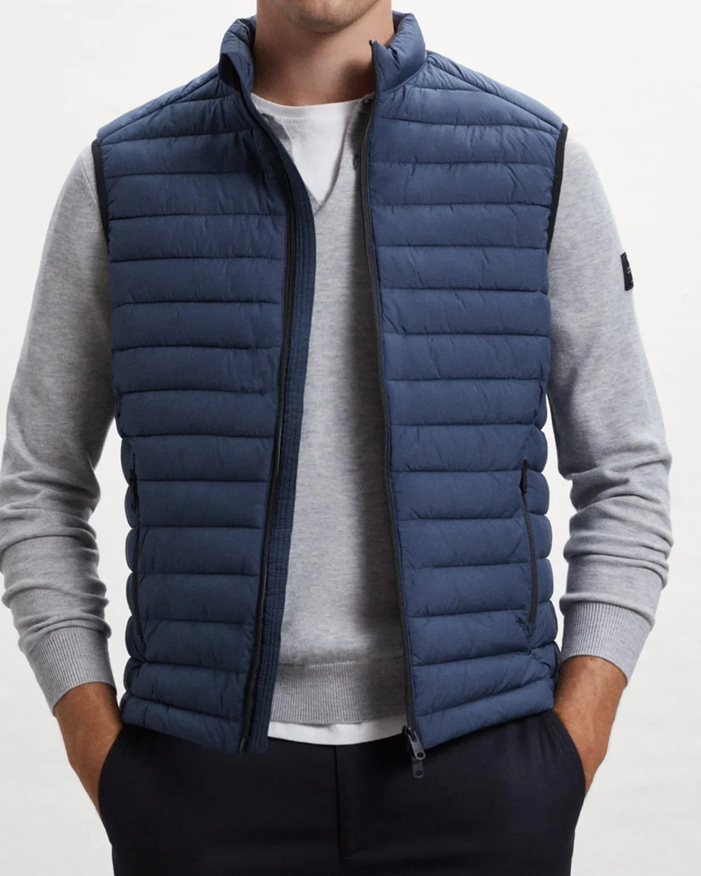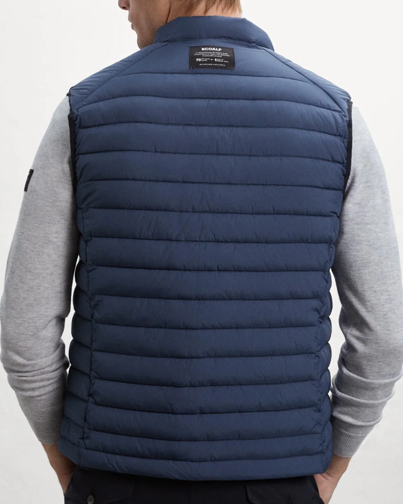Chaleco acolchado de la marca Ecoalf, en color azul. Se cierra con cremallera frontal bidireccional y tiene bolsillos laterales con cremallera.