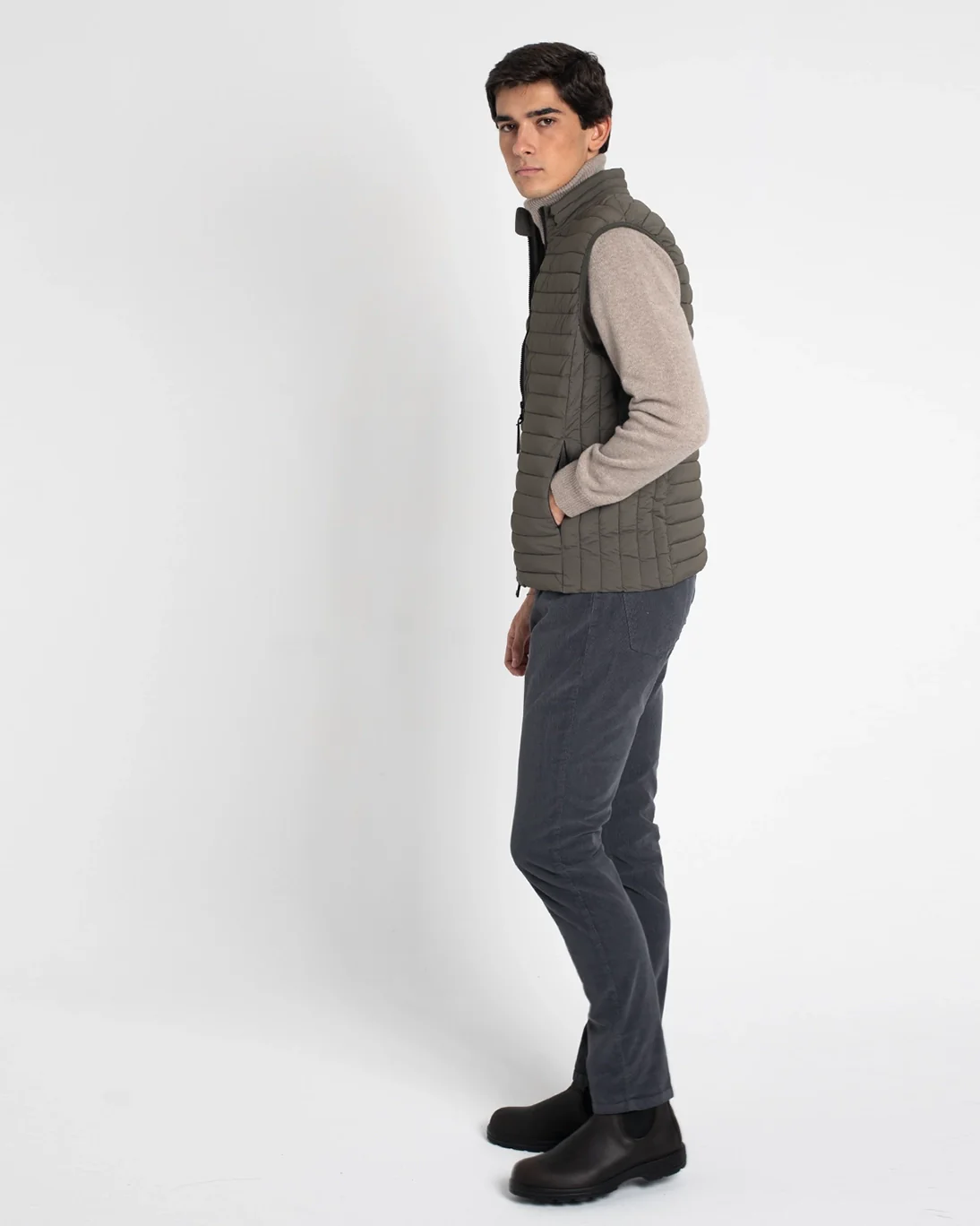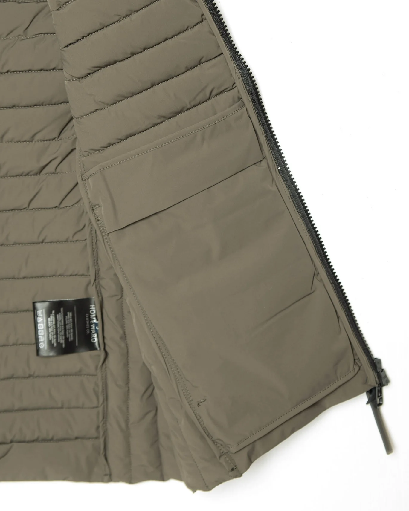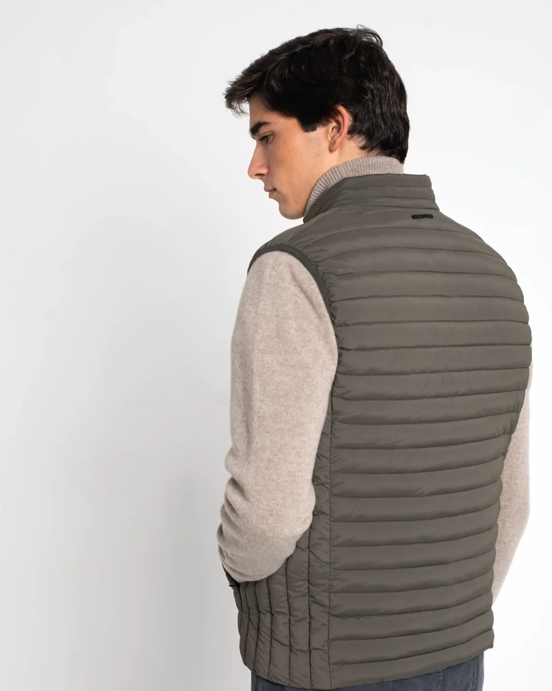 Chaleco acolchado de la marca Homeward, en color verde. Se cierra con cremallera frontal bidireccional y tiene bolsillos laterales con cremallera invisible. Además, tiene bolsillos en el interior.