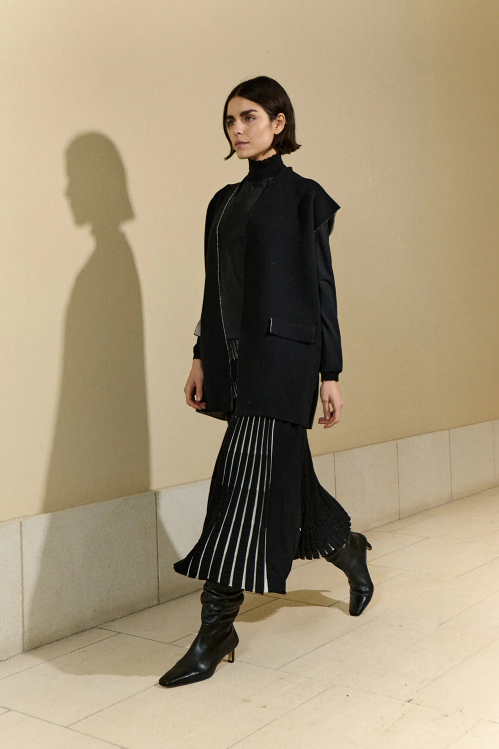 Chaleco de punto con patrón recto. Tejido a doble cara en contraste, galga 12. Tiene falsas bolsillos con solapa.