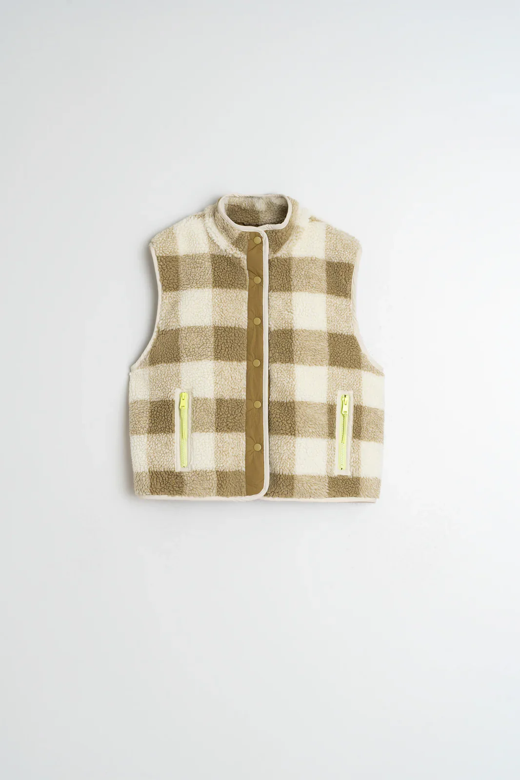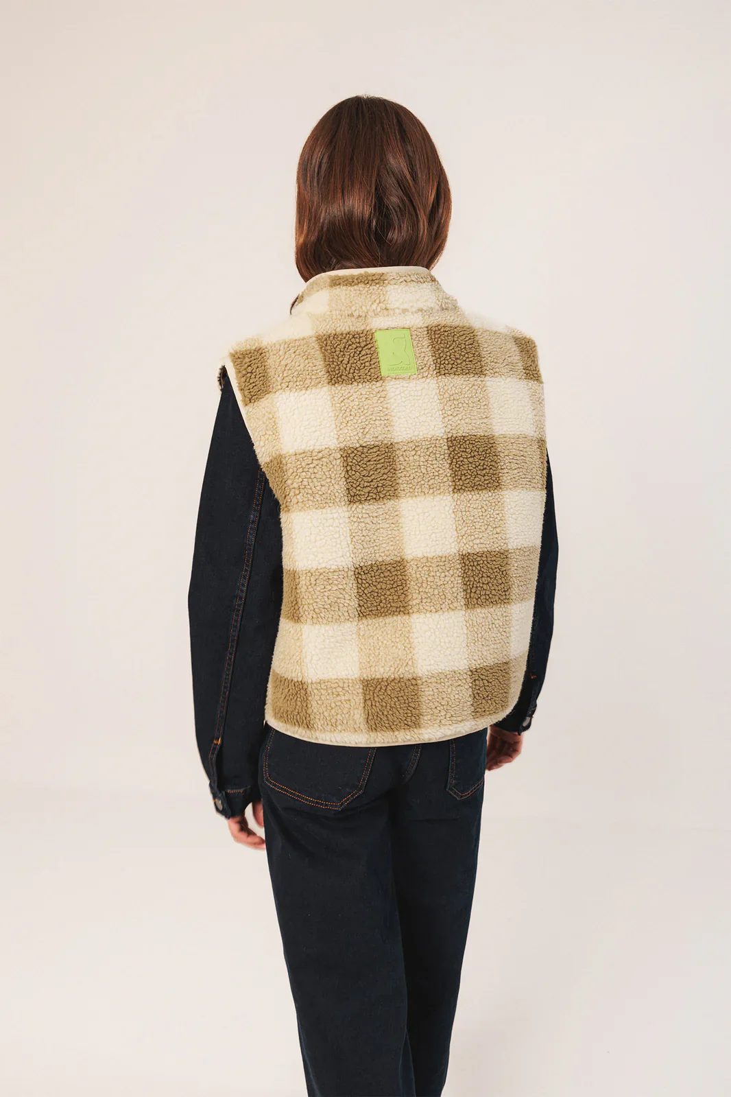 Los chalecos también elevan un look. Este de maxi cuadro vichy con efecto teddy y detalles en contraste son un indispensable en cuanto a prenda exterior.