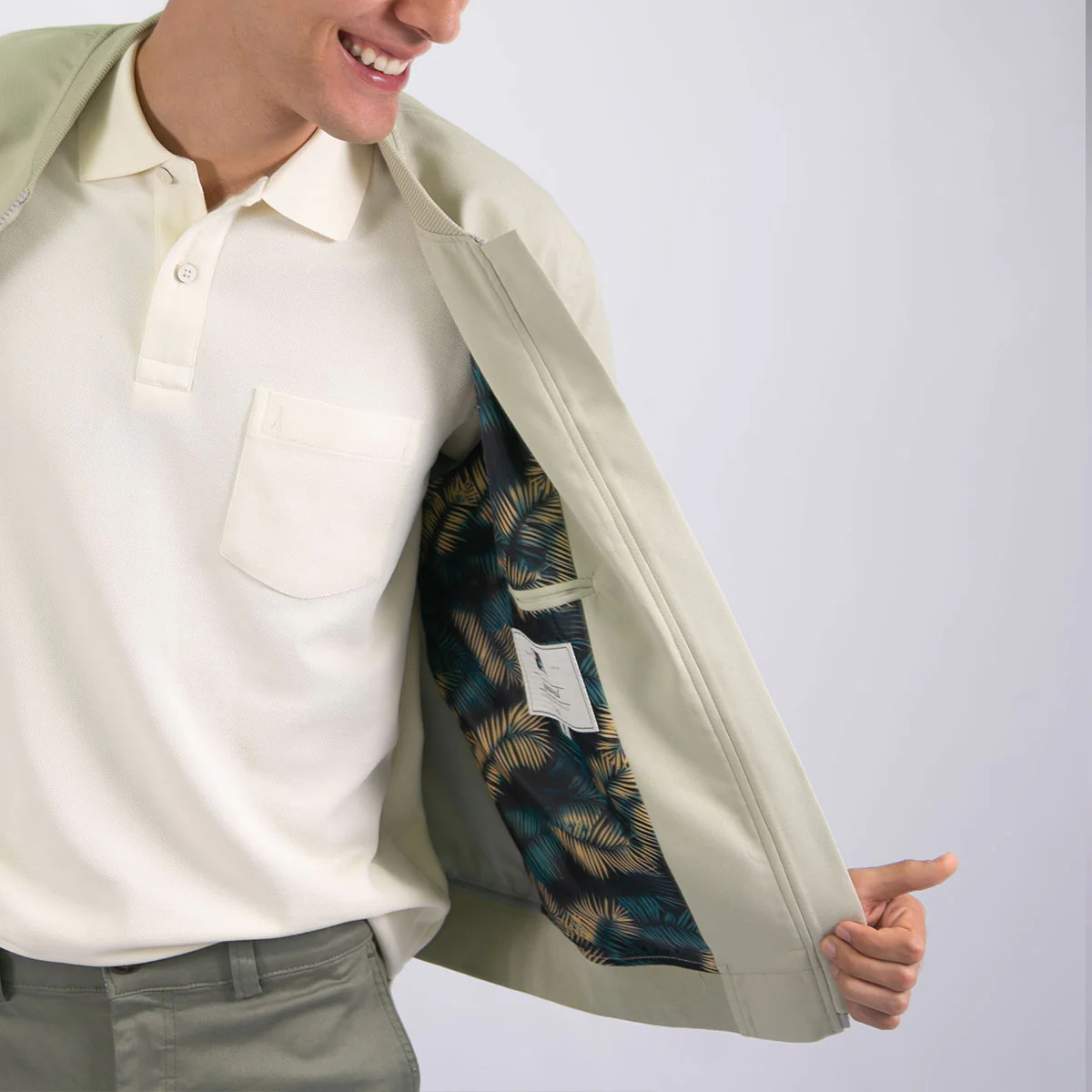 Su diseño incluye un cuello tipo bomber en rib, mangas largas con puños en rib y un cierre frontal con cremallera que facilita su uso. Cuenta con dos bolsillos frontales rectos con ribete de pestaña de 2,5 cm y un bolsillo interno en el lado izquierdo, ideal para guardar objetos personales de forma segura. El forro interior presenta un estampado con motivos de hojas en tonos oscuros y beige, que añade un toque de estilo oculto y exclusivo.