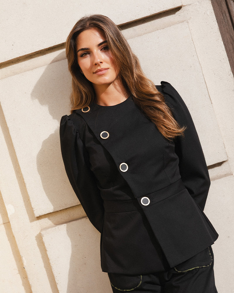 Cierre de solapa con cuatro botones y manga ligeramente rizada al hombro. Está totalmente forrada