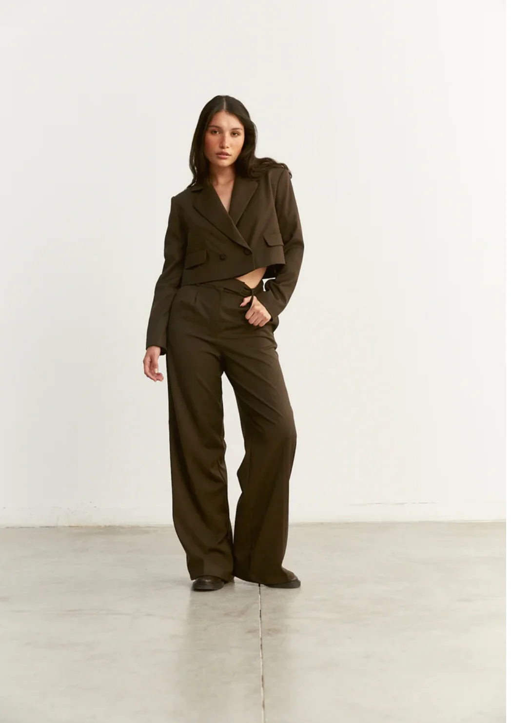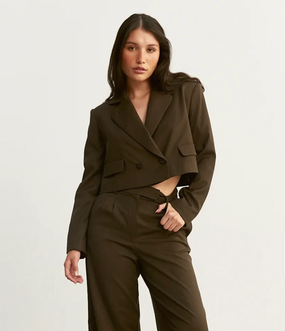 Chaqueta de traje crop con hombrera, bolsillos de parche y botón.