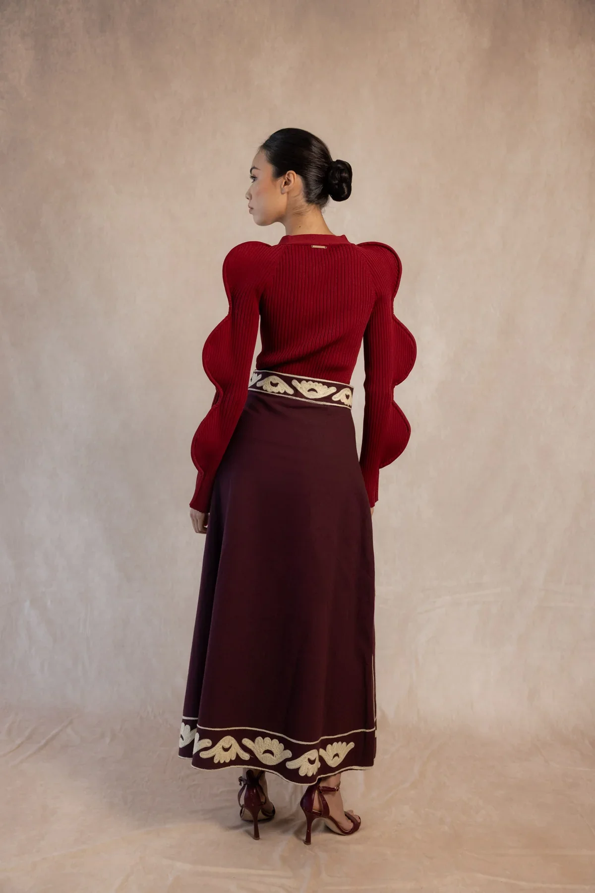 El diseño destaca por sus mangas globo con volumen curvado, una tendencia clave que aporta dramatismo y feminidad. El escote en pico con cierre de botón joya añade un detalle sutil pero llamativo.