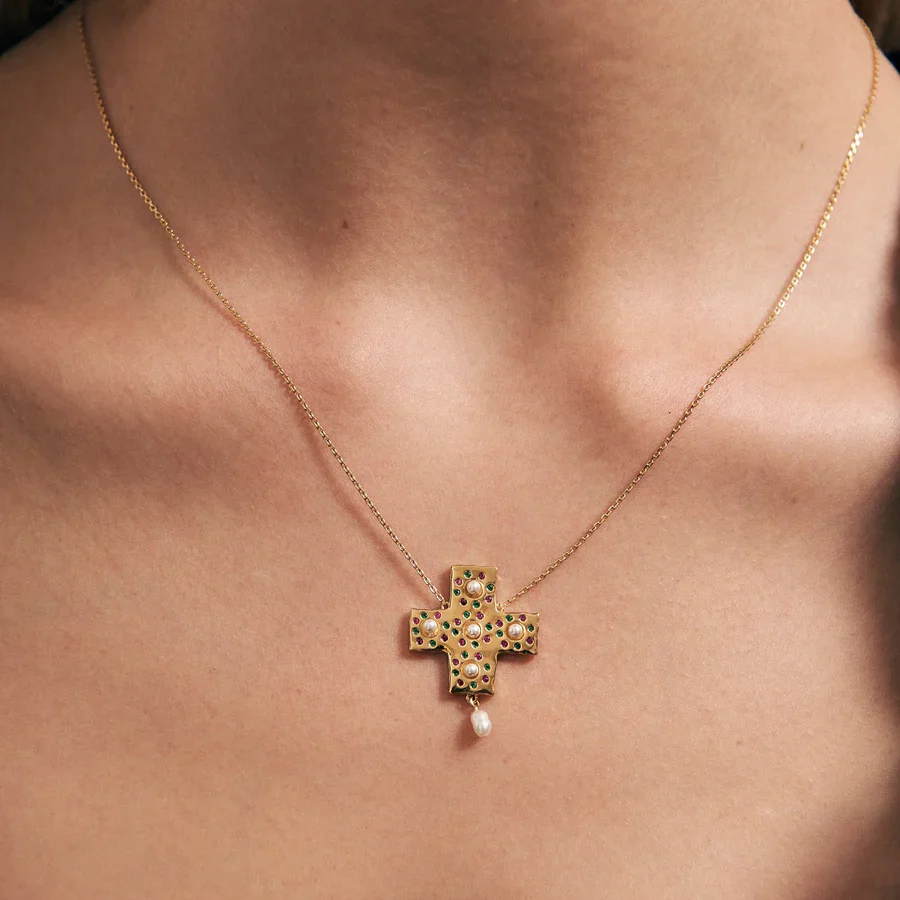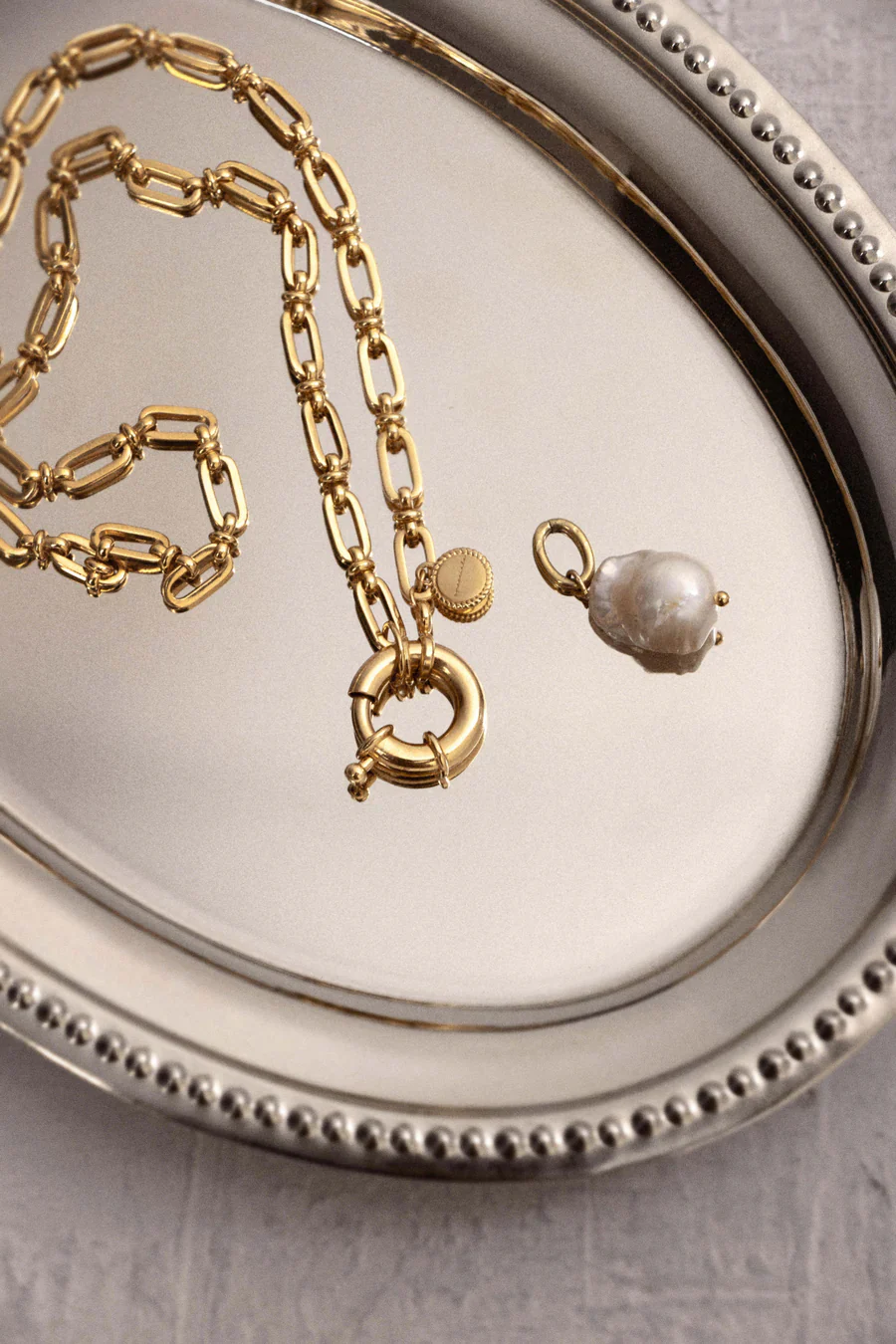 Su composición en latón chapado en oro de 24k y 18k aporta un brillo cálido y orgánico que recuerda a los metales trabajados a mano en la antigüedad.