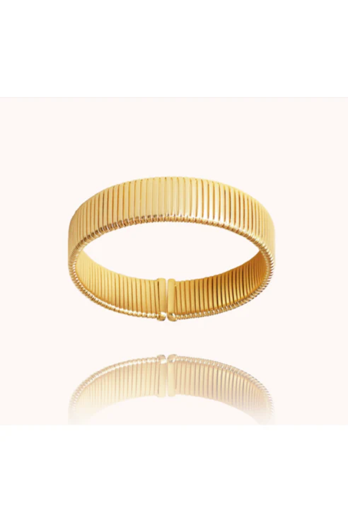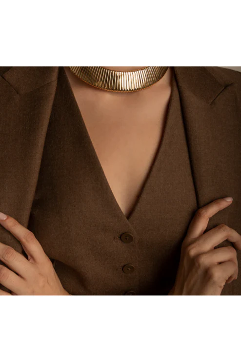 Gargantilla tipo choker de latón en acabado dorado. La medida del choker es de 12 cm de diámetro. Es flexible, cómodo y fácil de colocar.