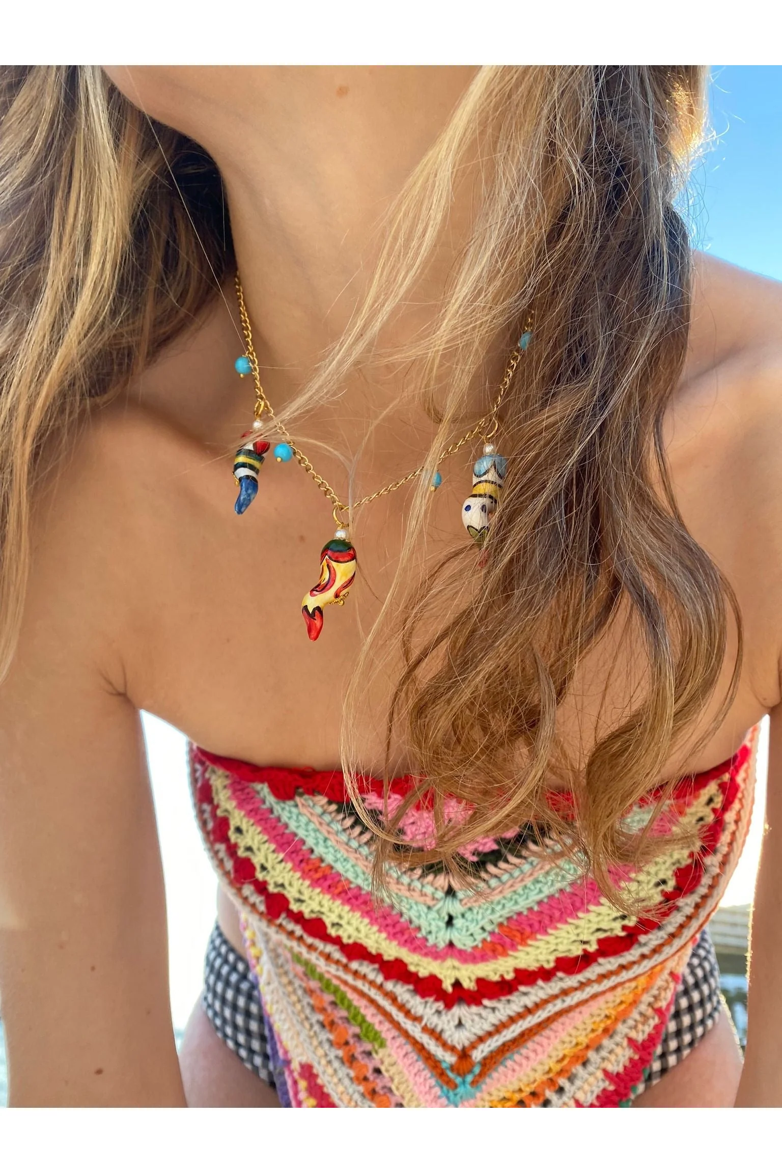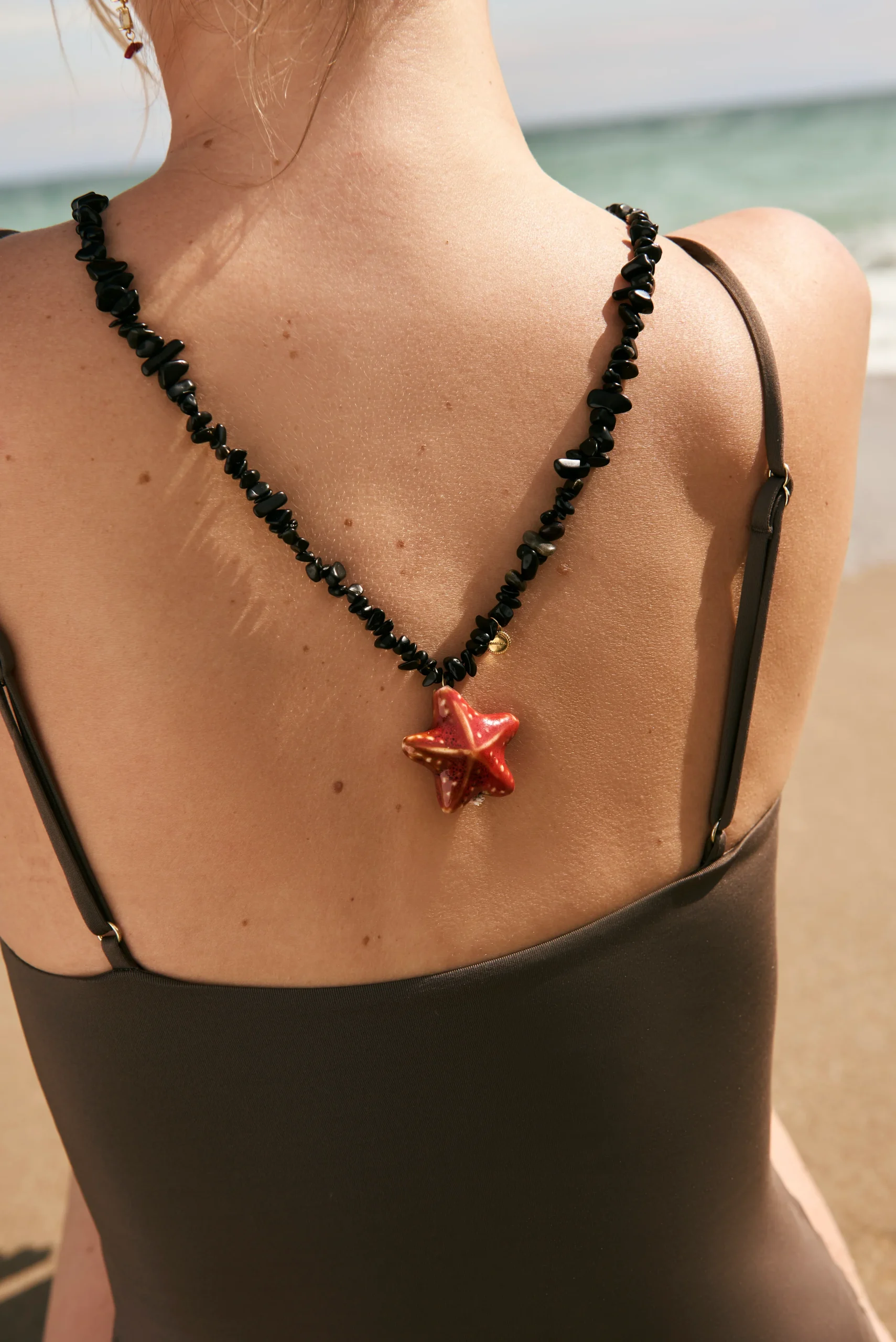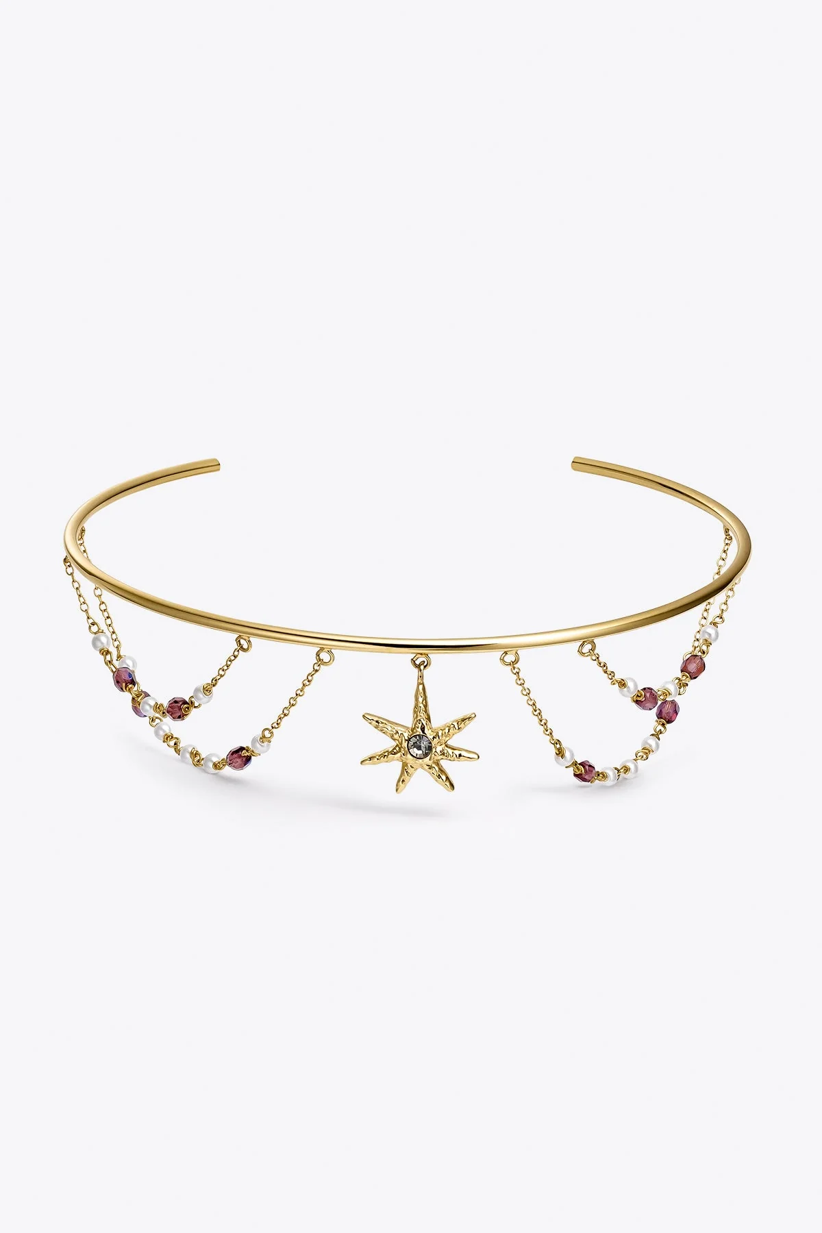 Este collar dorado estilo gargantilla está compuesto por un choker rígido con un charm de estrella de 2 centímetros de tamaño y dos cadenas simétricas con cristales y perlas engarzadas.