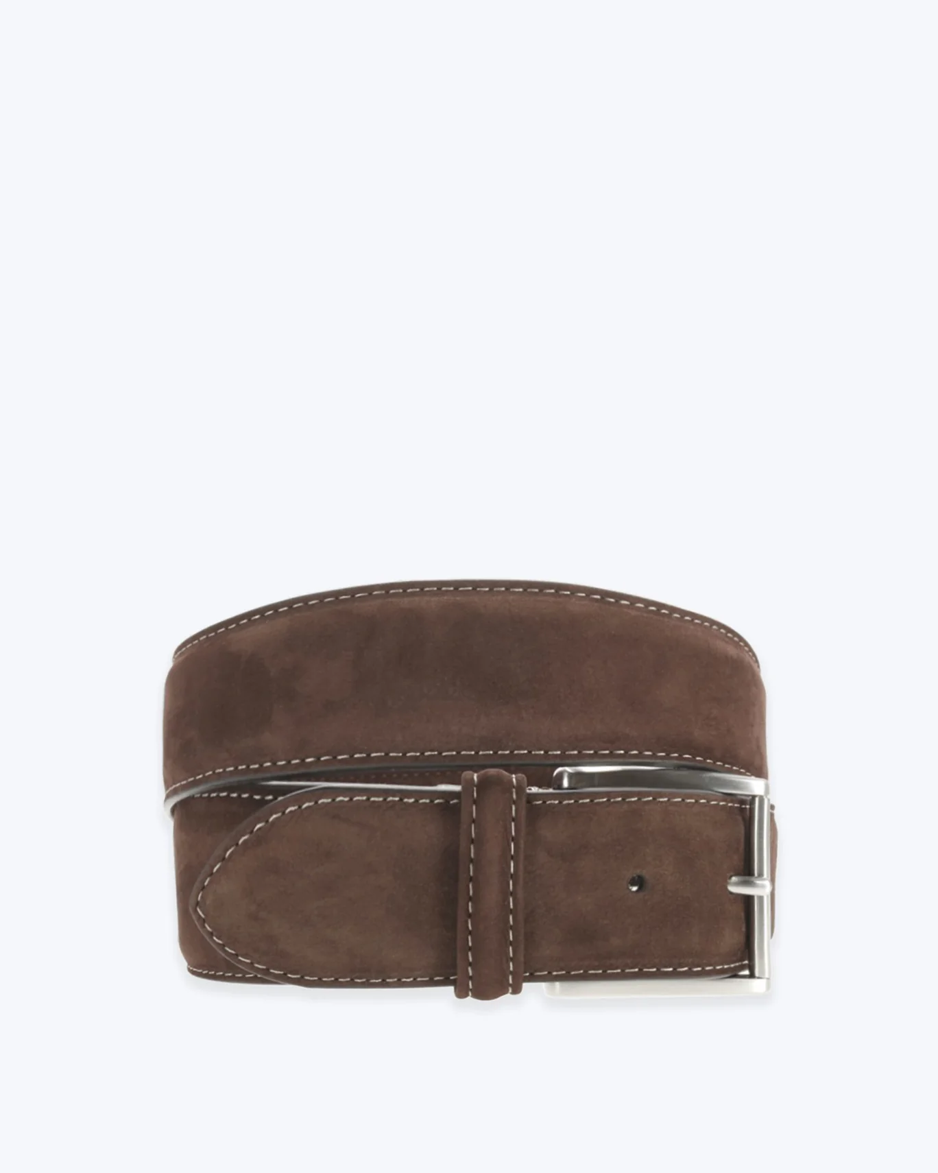 Cinturón de la marca Anderson´s de ante marrón, con hebilla plateada y pespunte blanco.