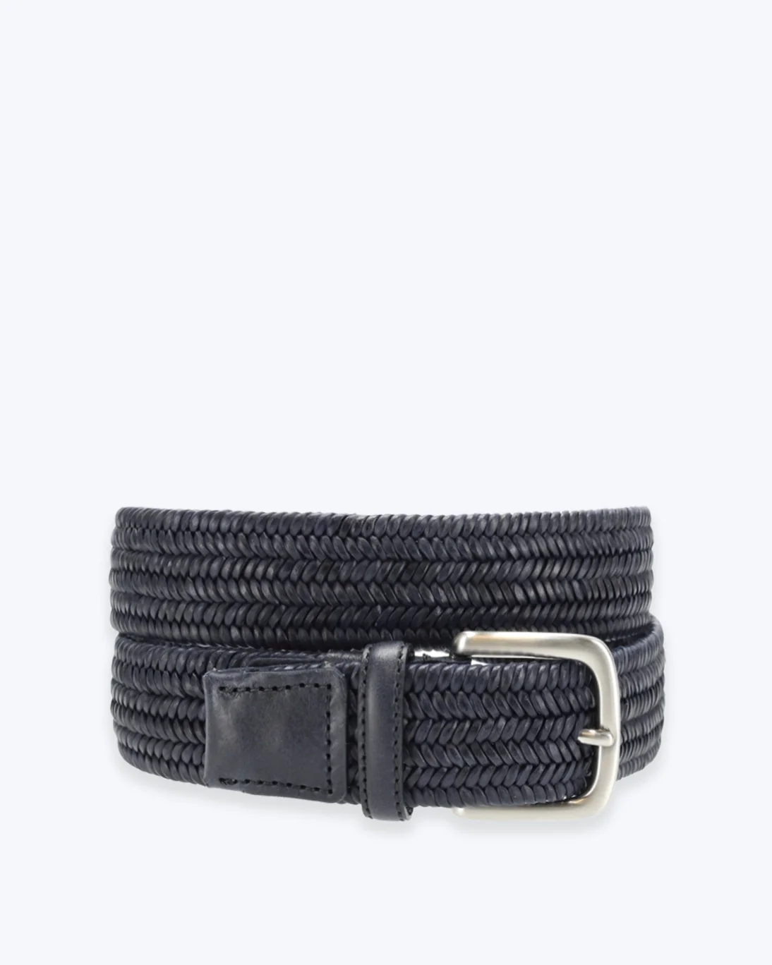 Cinturón trenzado elástico de la marca Gavazzeni en color azul, con hebilla cuadrada y remates en piel azul.