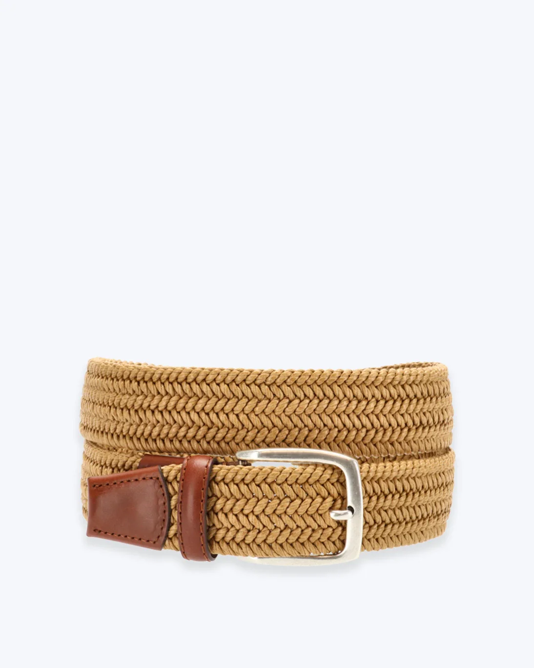 Cinturón elástico trenzado de espiga en color ocre, de la marca Fulham, con detalles en piel marrón.