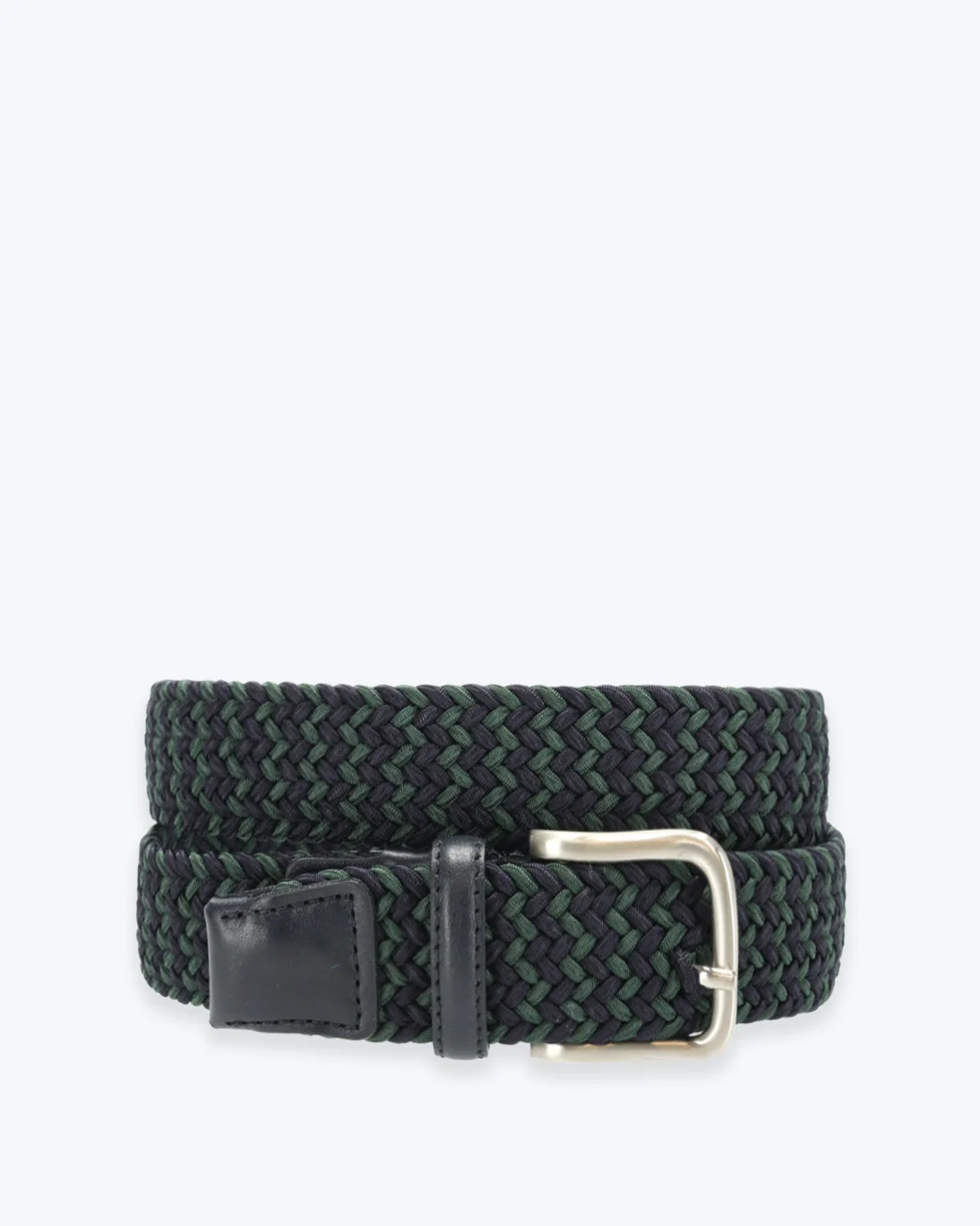 Cinturón trenzado elástico de la marca Gavazeni en color azul y verde, con hebilla cuadrada y remates en piel azul.