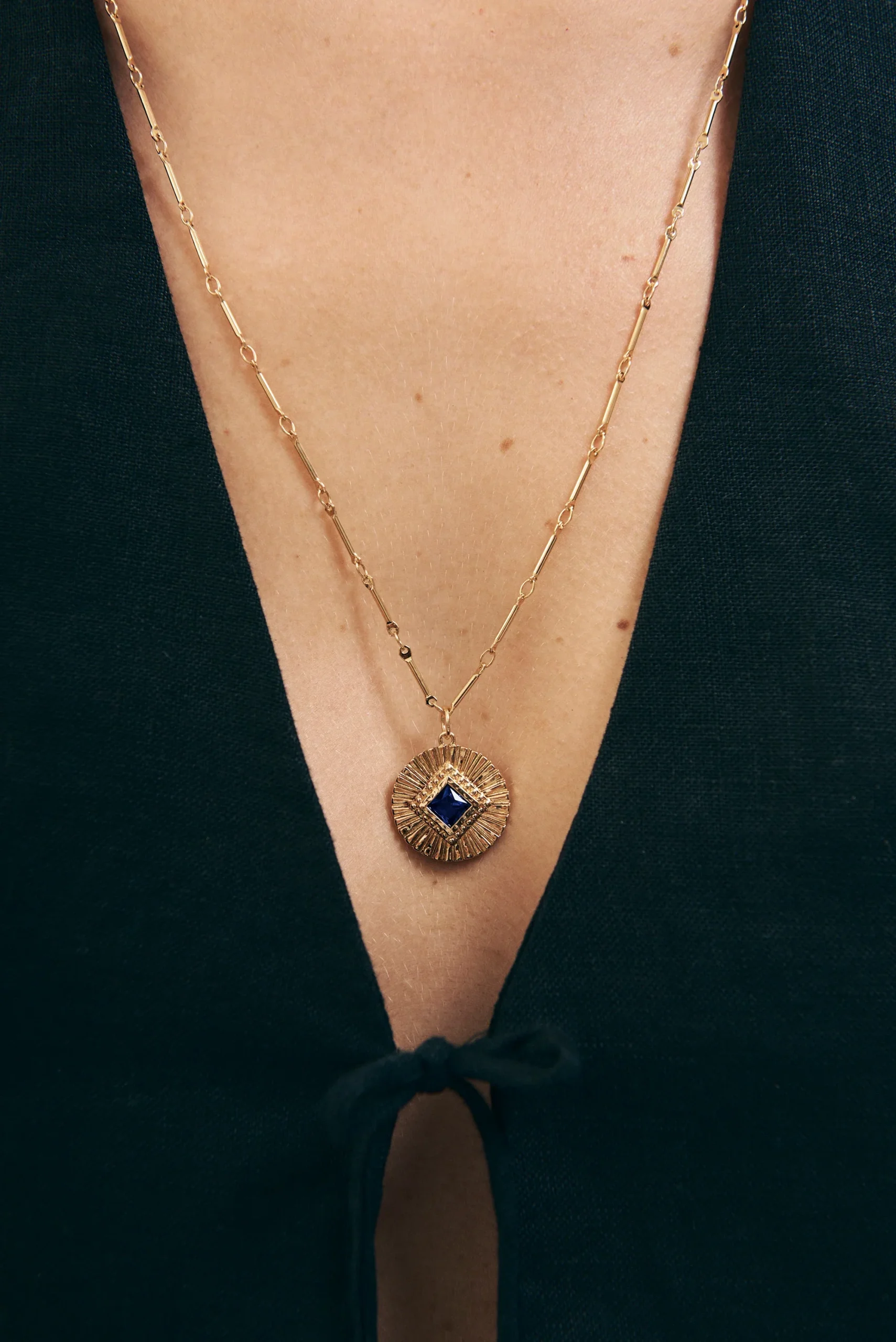 Collar cadena de Latón chapado en 3 micras en Oro de 18k formado por una medalla tallada a mano y con una circonita engastada en el centro.