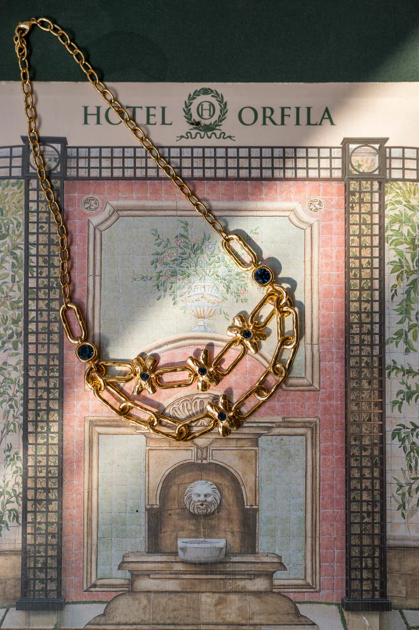 Su diseño entrelaza eslabones dorados con cruces de inspiración orgánica, trabajadas con un efecto martelé que resalta cada detalle. En el centro de cada cruz, un cristal checo de intenso azul zafiro aporta profundidad y sofisticación al conjunto.