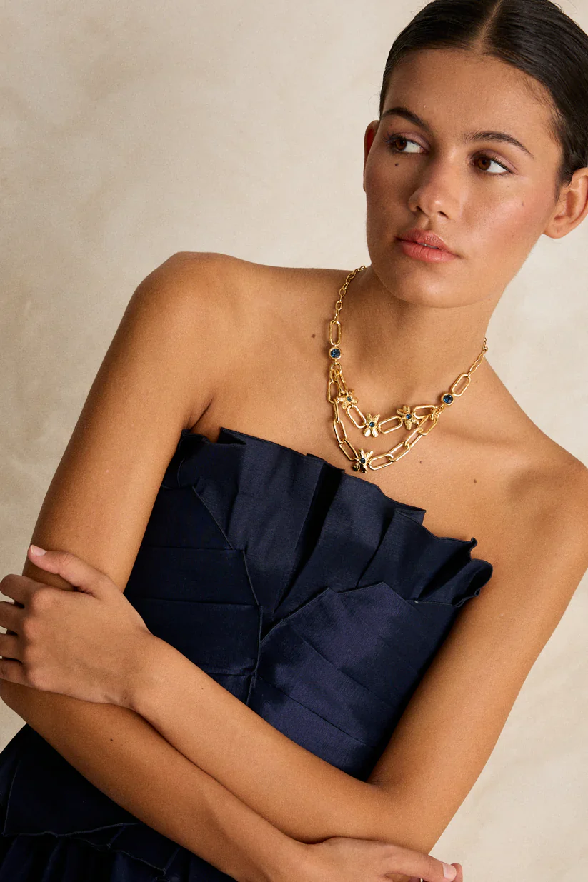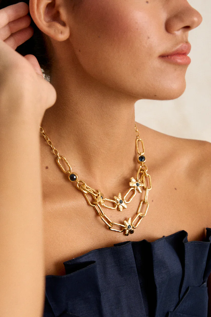 Este collar de doble cadena combina fuerza y delicadeza en una composición que evoca lo natural con un giro contemporáneo.