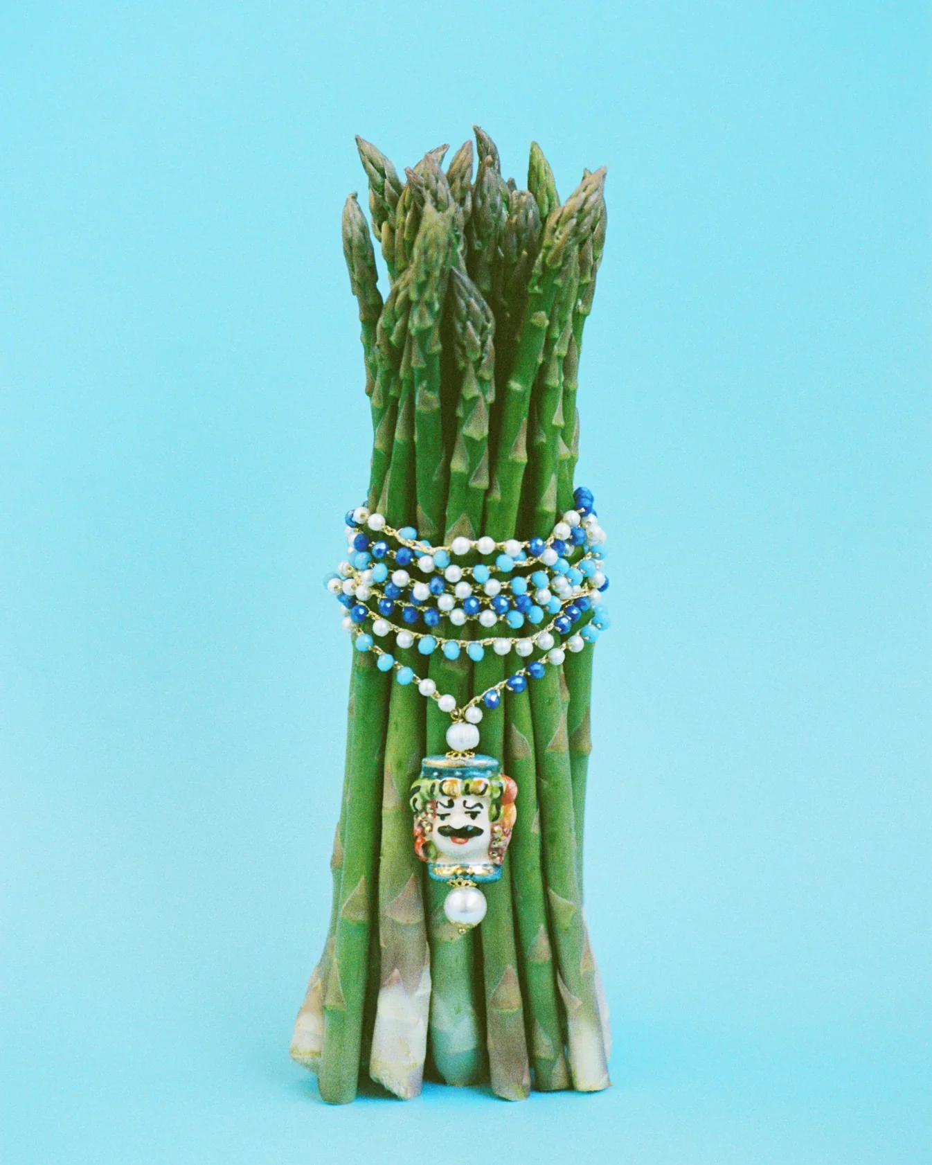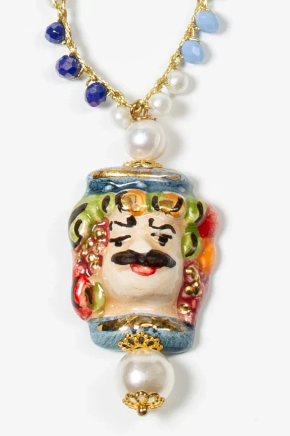 Filippo es una oda a la elegancia teatral con espíritu siciliano. Su diseño largo y estilizado está compuesto por cuentas de cristal en azul profundo y blanco hielo, entrelazadas con hilo dorado que aporta un brillo cálido y discreto. En el centro, un colgante de cerámica pintado a mano representa un rostro masculino coronado, con detalles florales y una expresión regia que remite al folclore barroco del sur de Italia.