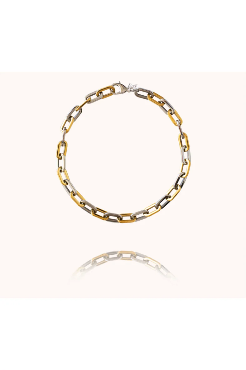 Collar de acero inoxidable combinado dorado y plateado. La medida del collar es de 45 cm.