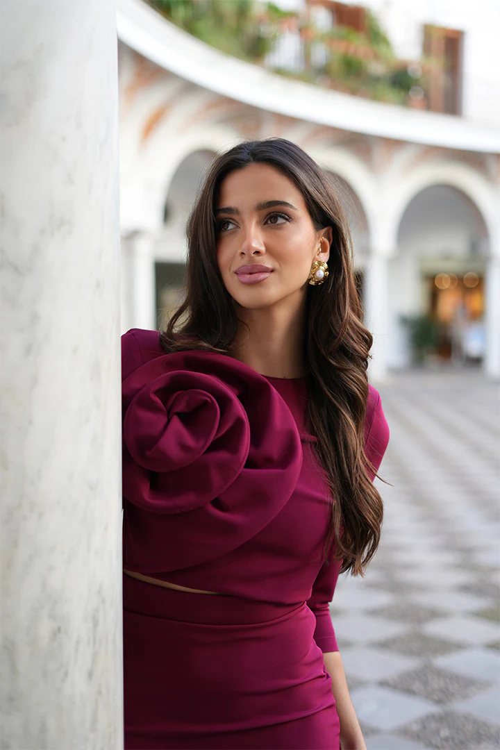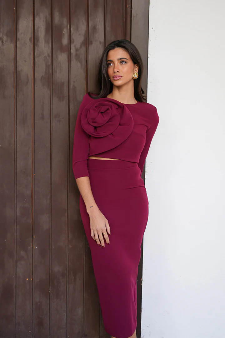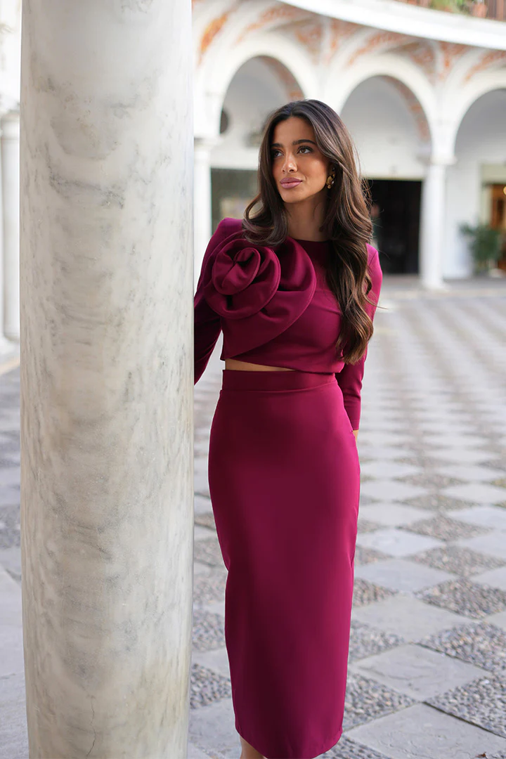 Conjunto de 2 piezas, Crop top abotonado en espalda con sus botones forrados de la misma tela conjuntado con una falda a juego de tiro alto. Ambas partes forradas.