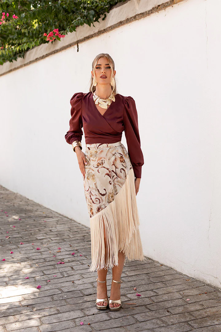 Precioso conjunto de dos piezas Top y falda con flecos, confeccionado en un tejido de satén de alta calidad. Con forro tanto la blusa como la falda.