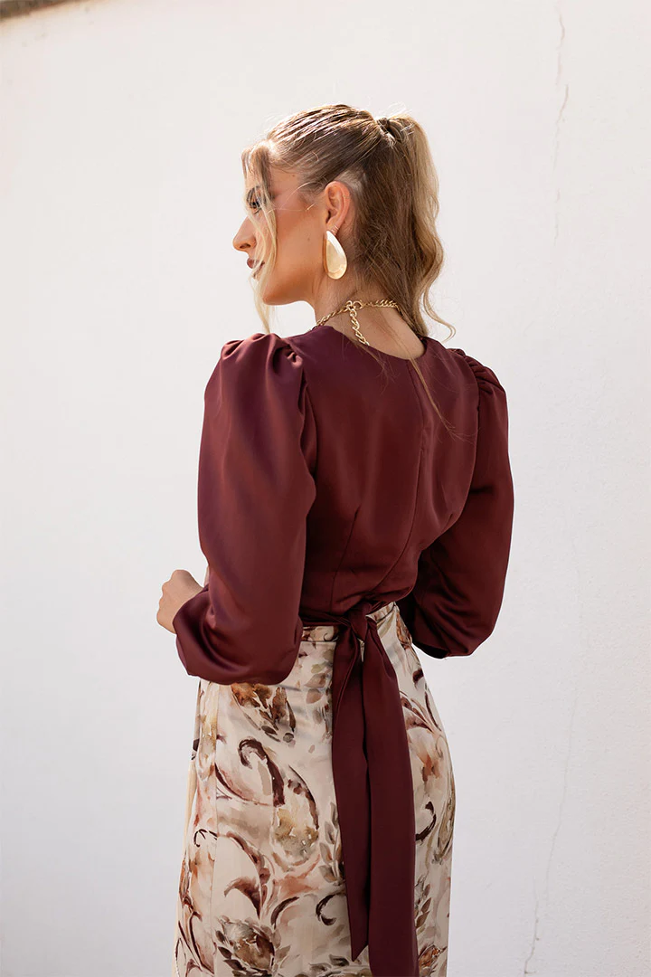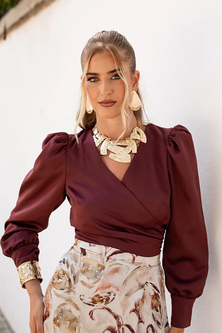 La blusa va cruzada y anudada en lazada que se puede poner delantera o trasera