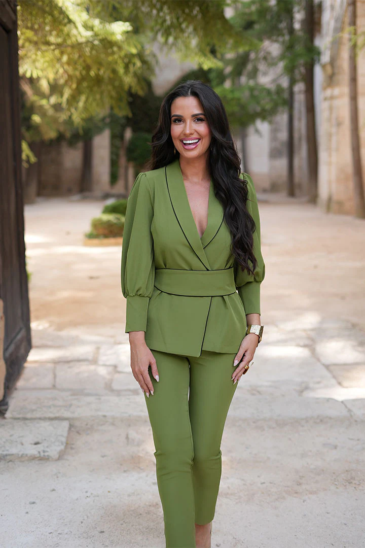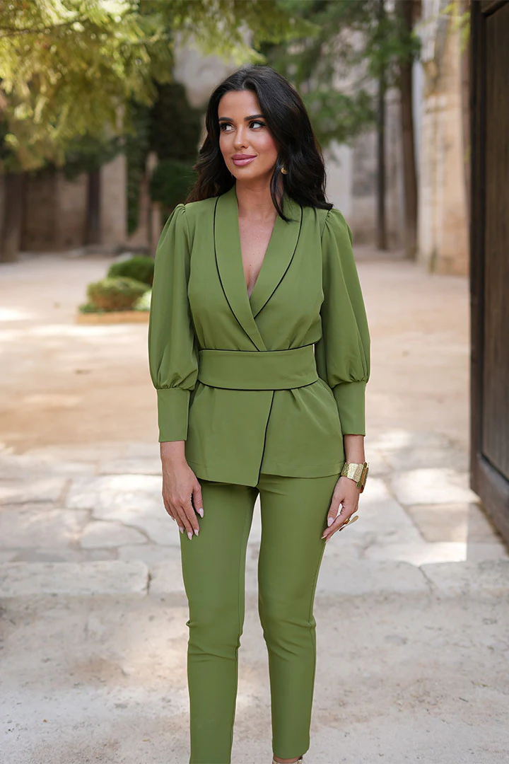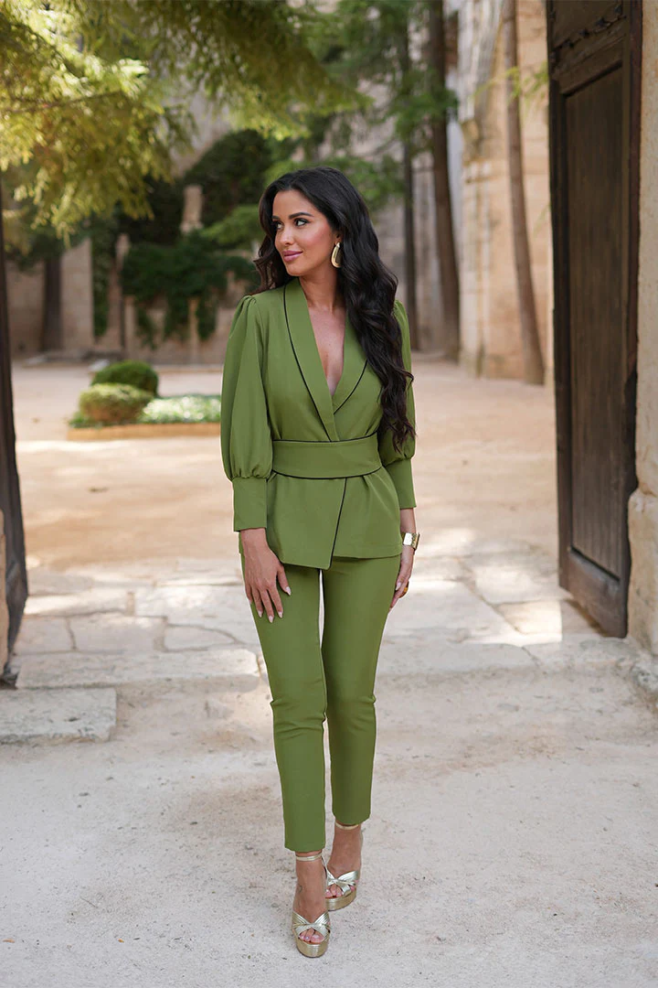 Conjunto de dos piezas, biolastico, pantalón de corte recto y ajustado a la cintura de tiro alto. Blazer de manga francesa perfecta para este otoño.
