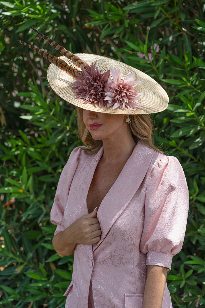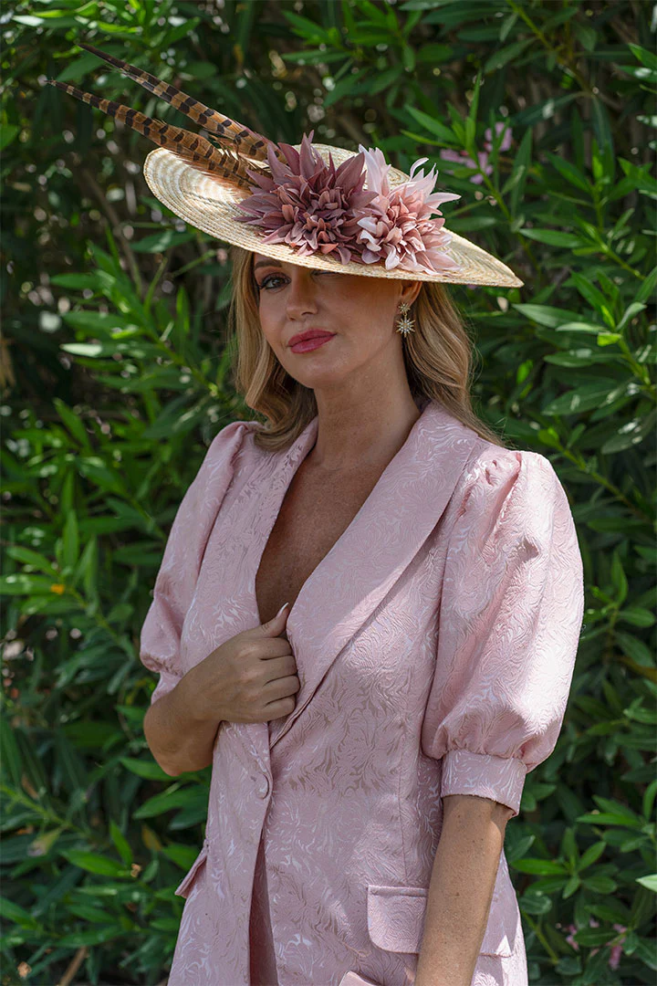 Conjunto de dos piezas, tela de jaquard en color rosa bebé, pantalón de corte recto acampanado y ajustado a la cintura de tiro alto. Blazer de manga corta perfecta para todos eventos.