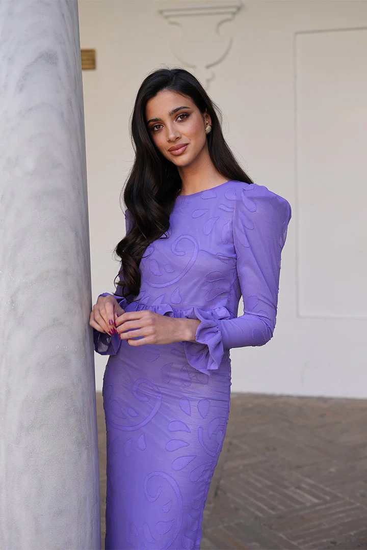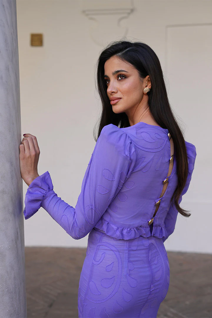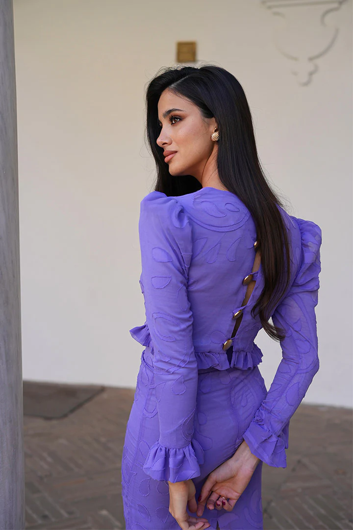 Conjunto de jacquar floral en color lila único y exclusivo este diseño de nuestra tienda, tanto el color como el modelo.