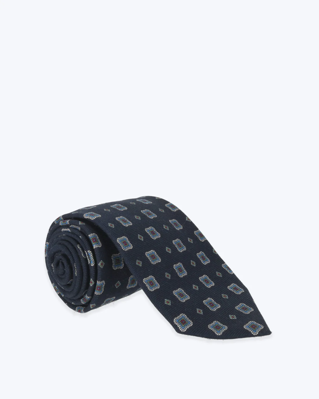 Corbata de seda y lana de la marca Fulham, en color navy con dibujos azules y blancos.