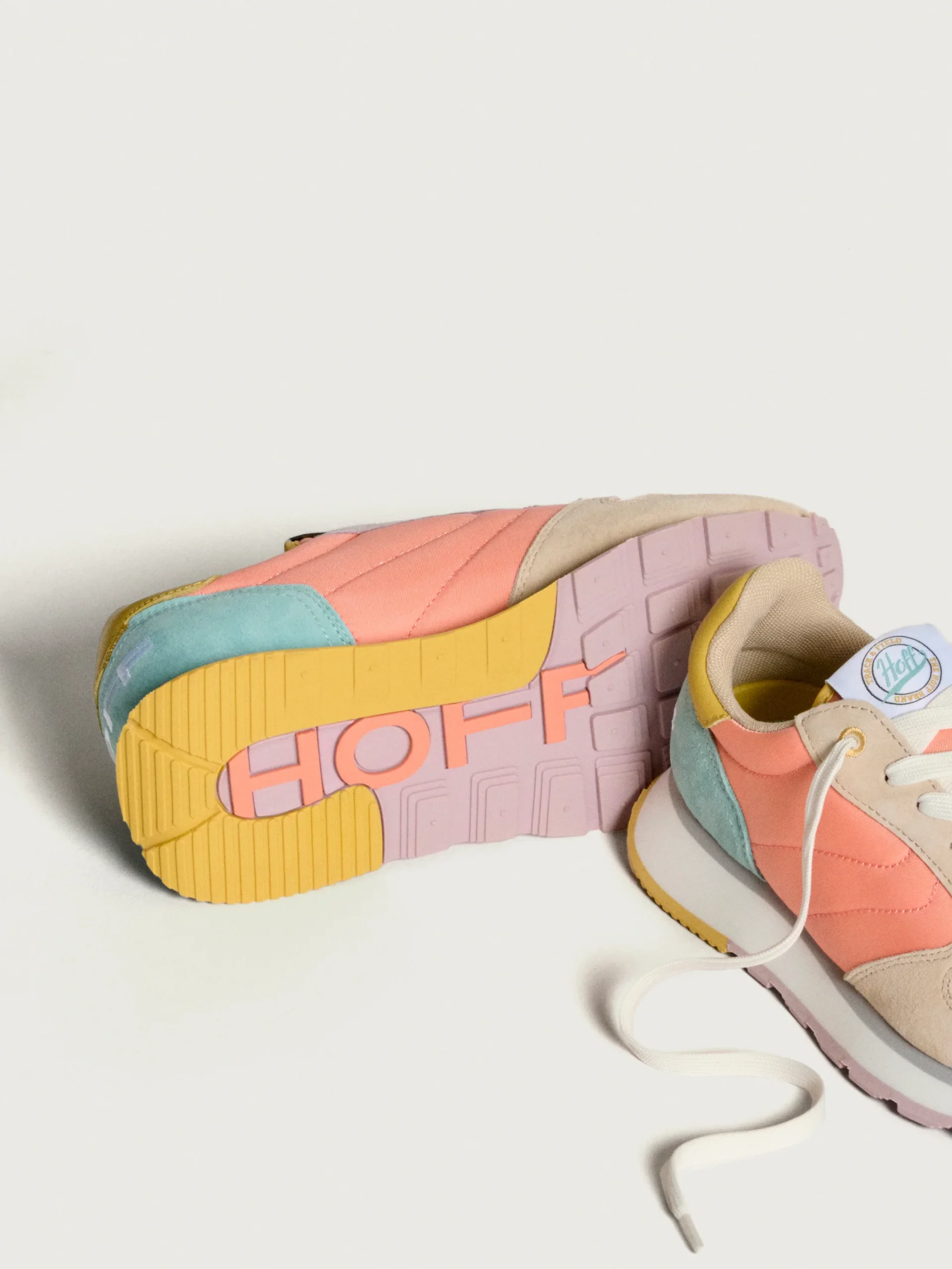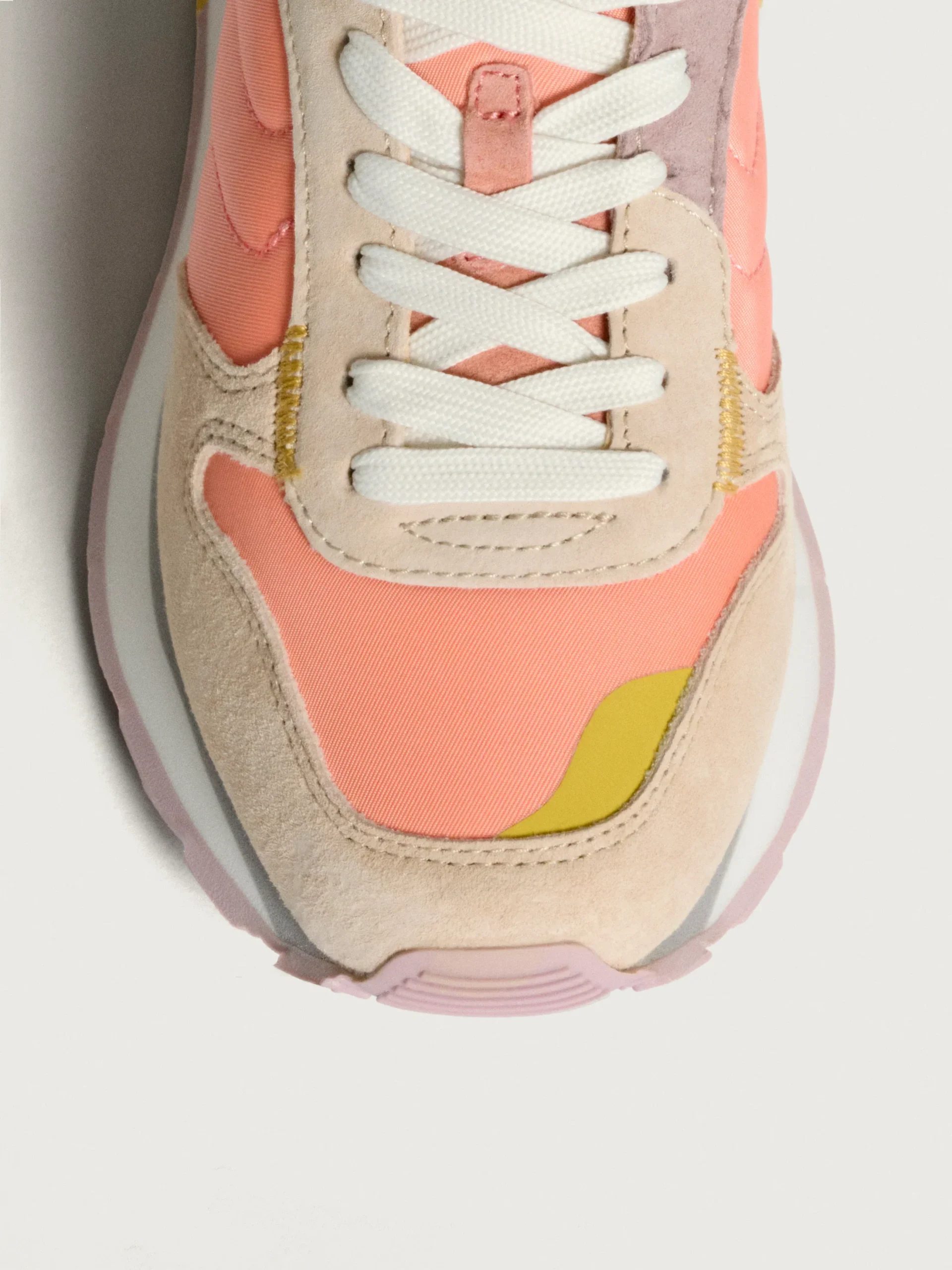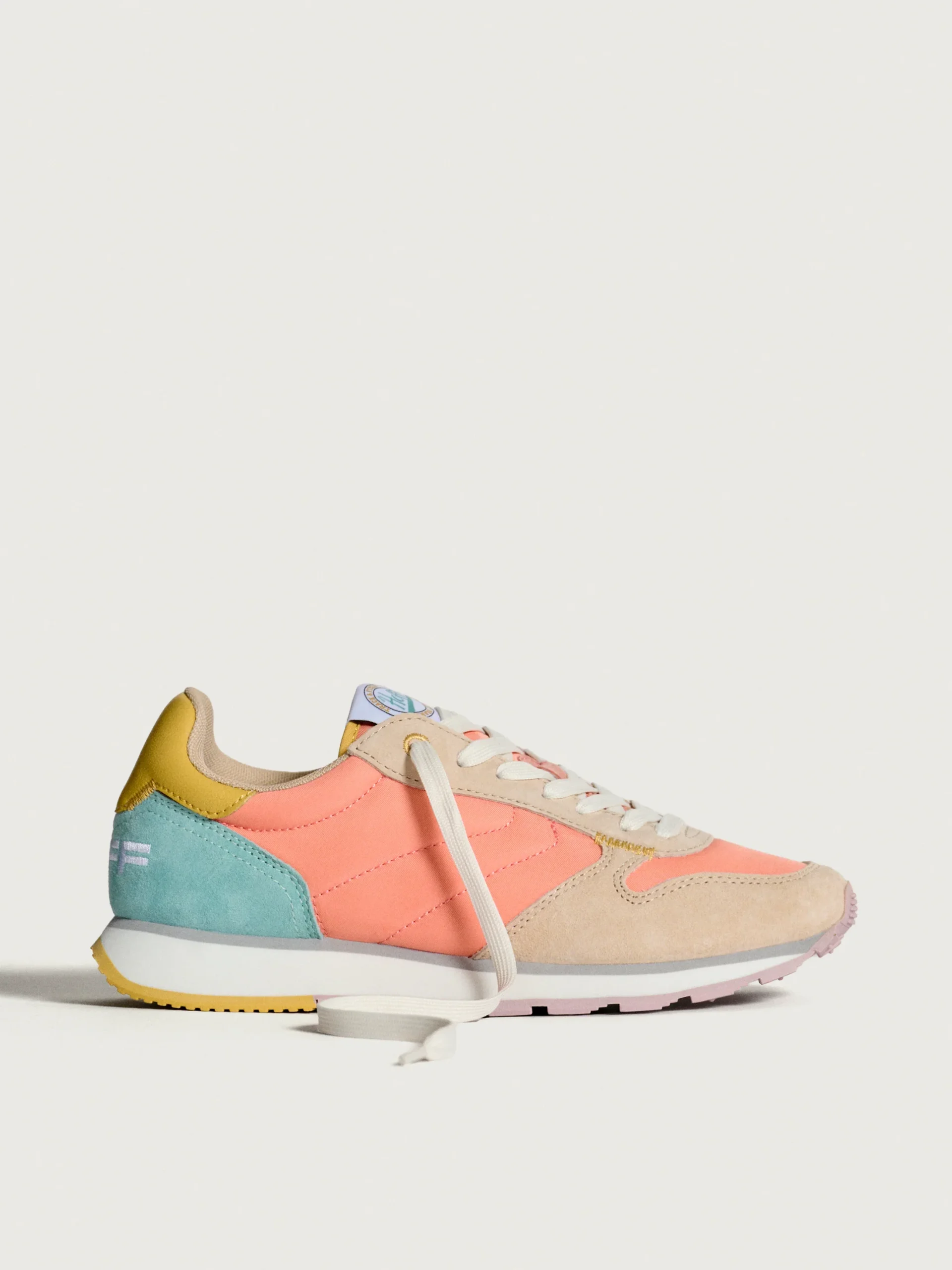 Un diseño para los amantes del estilo retro y vintage, las CRETE en nylon salmón con detalles asimétricos en ante malva y aguamarina son la mezcla perfecta para resaltar con unas zapatillas clásicas pero modernas. El ante en tono caqui en la parte frontal y el logo bordado aporta un toque premium. La suela con diseño gofre en tonos lila y mostaza, junto con el logo contramarcado, son la guinda del pastel. Su ligereza y comodidad están garantizadas gracias a la plantilla memory-foam. Son perfectas para combinar con jeans clásicos y tu camiseta favorita.