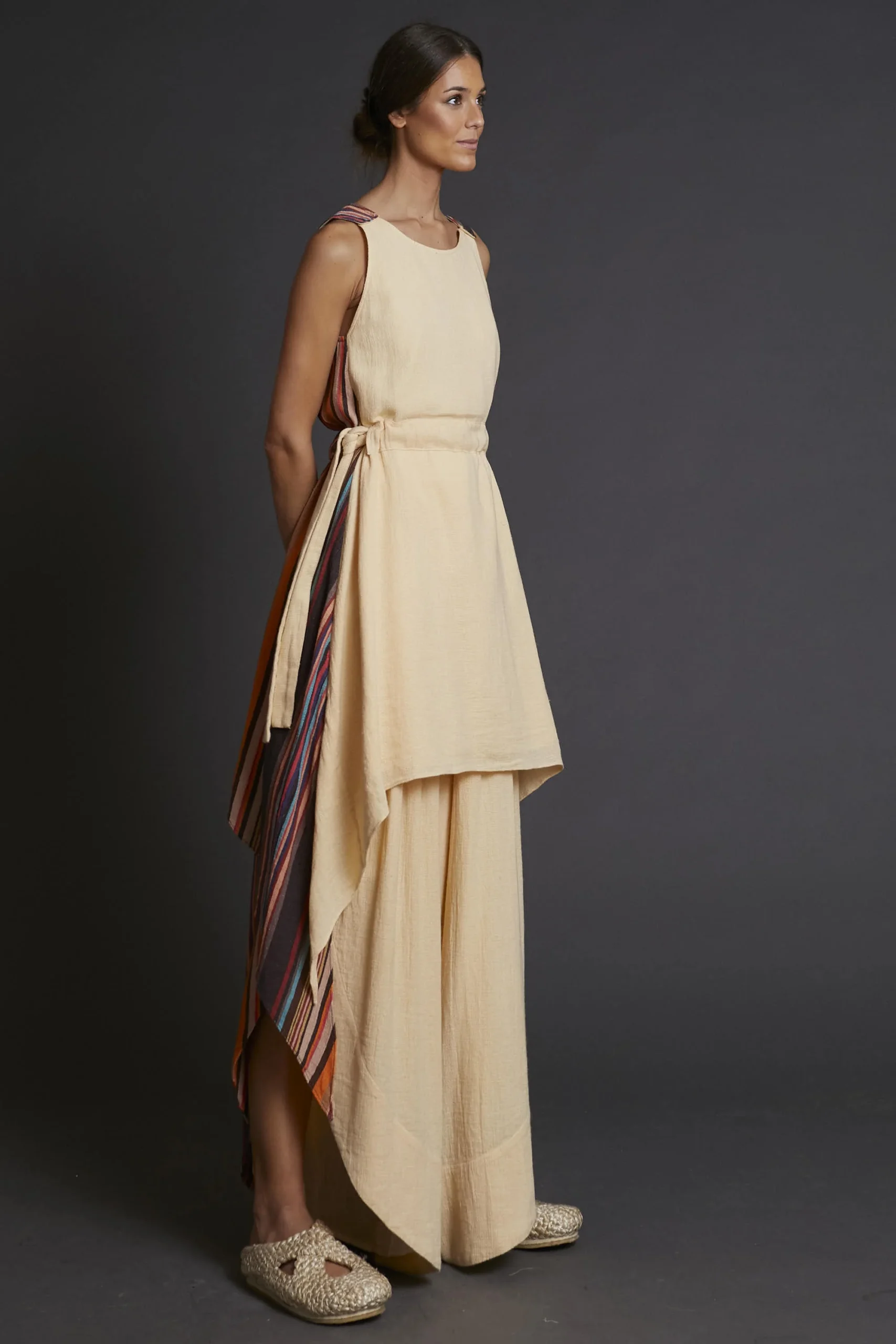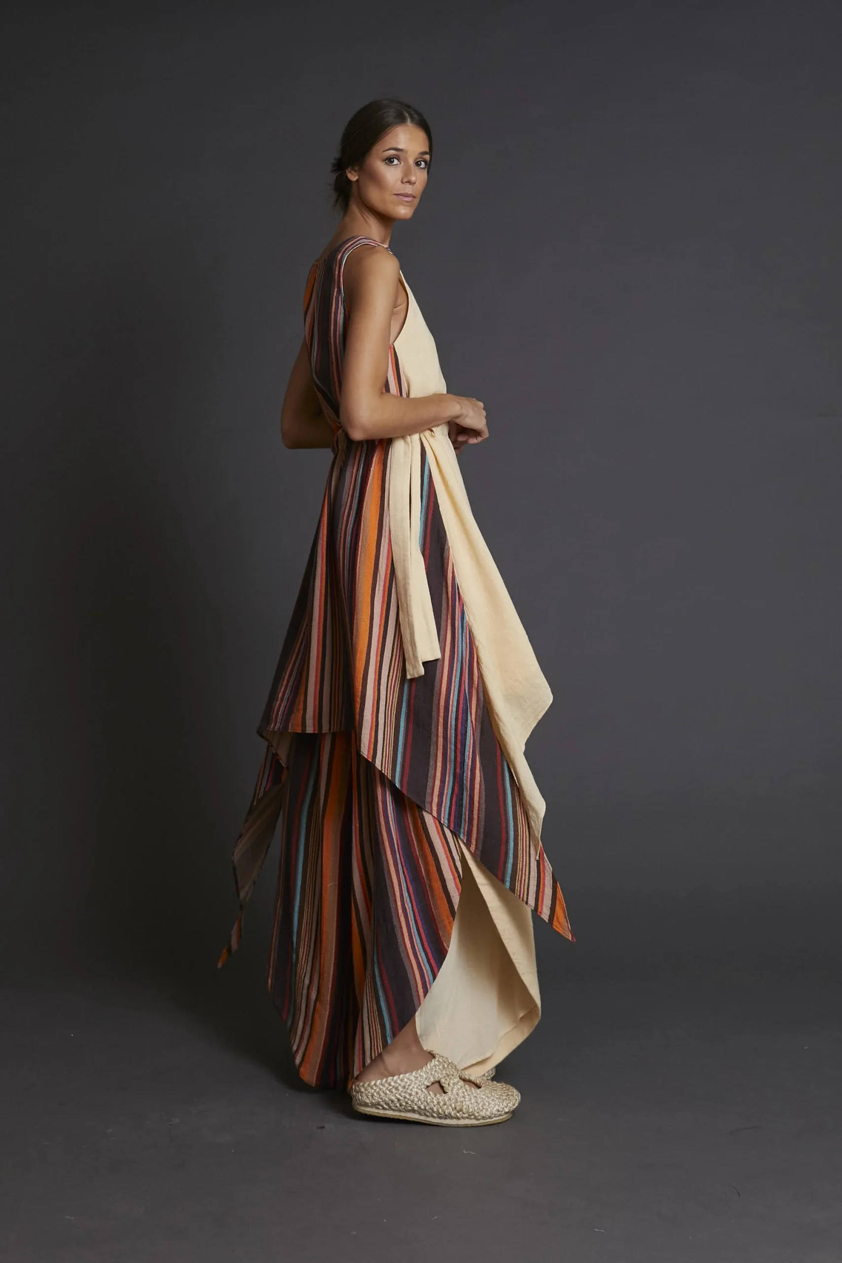 Cuerpo tirante ancho, fruncido en la cintura mediante lazo, delantera lisa y trasera raya vertical multicolor. Tejido rustico. Marca Zaitegui Studio