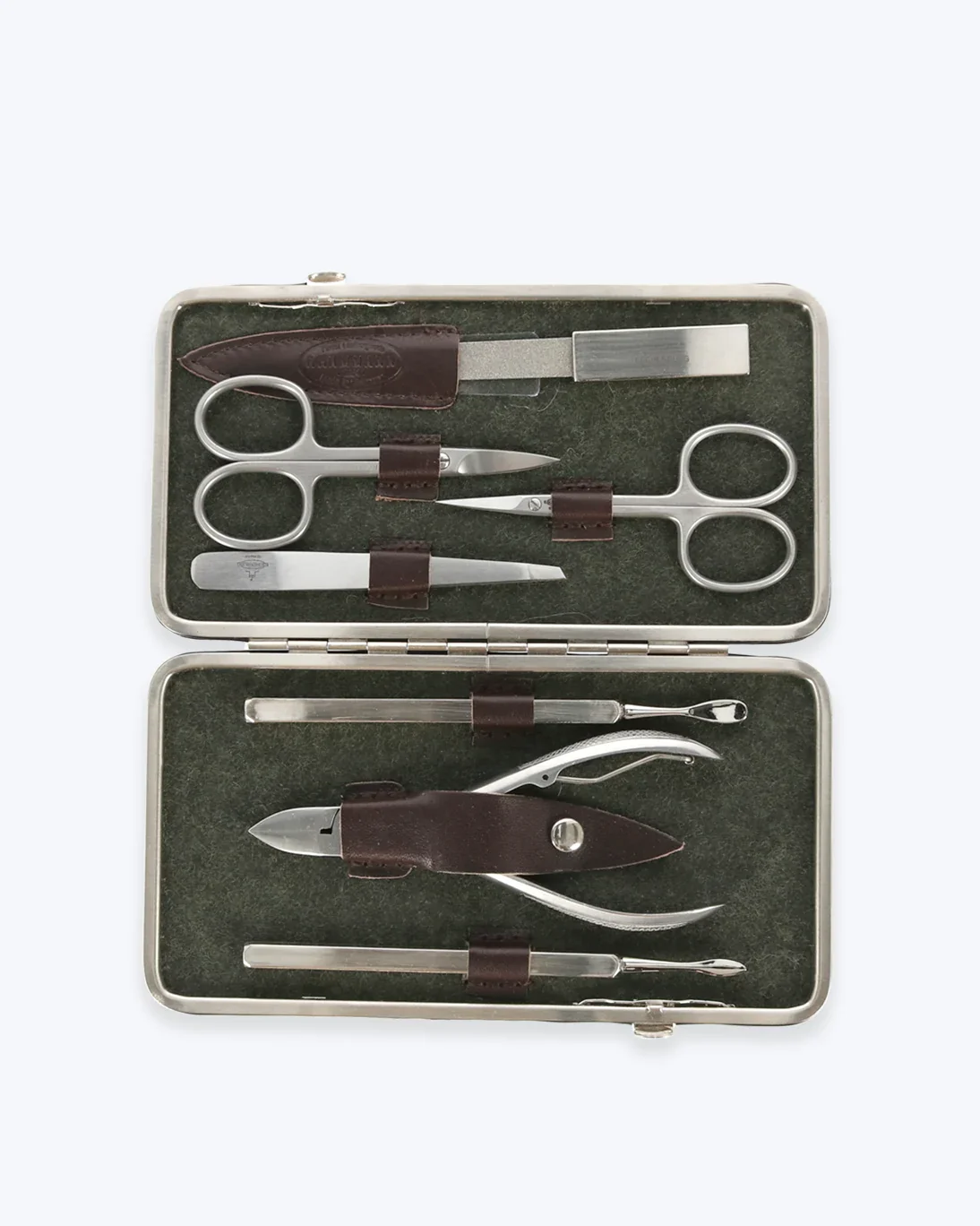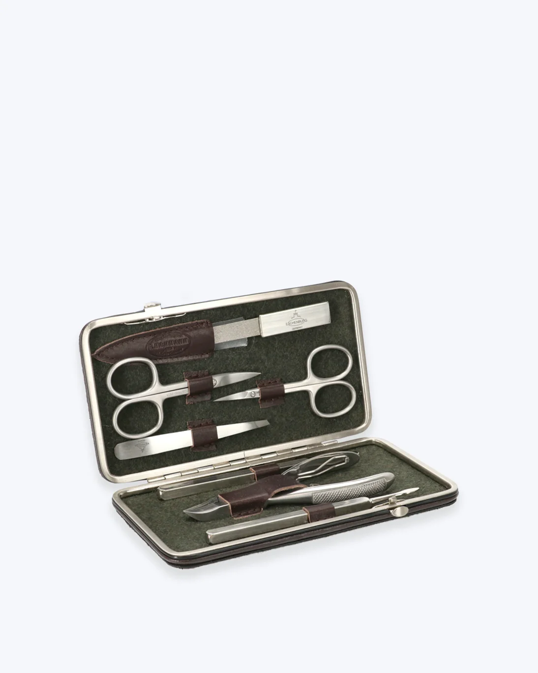 Estuche de manicura y pedicura de la marca F.Hammann, de color verde loden. Contiene utensilios como tijeras, lima para uñas, cortaplumas, pinzas, alicate para uñas.