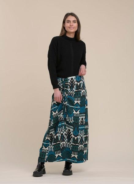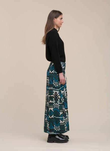 Falda larga fluida y con vuelo, estampado étnico, cordón de efecto plisado en la cintura, cierre de cremallera invisible en la espalda. Marca La Fée Maraboutée