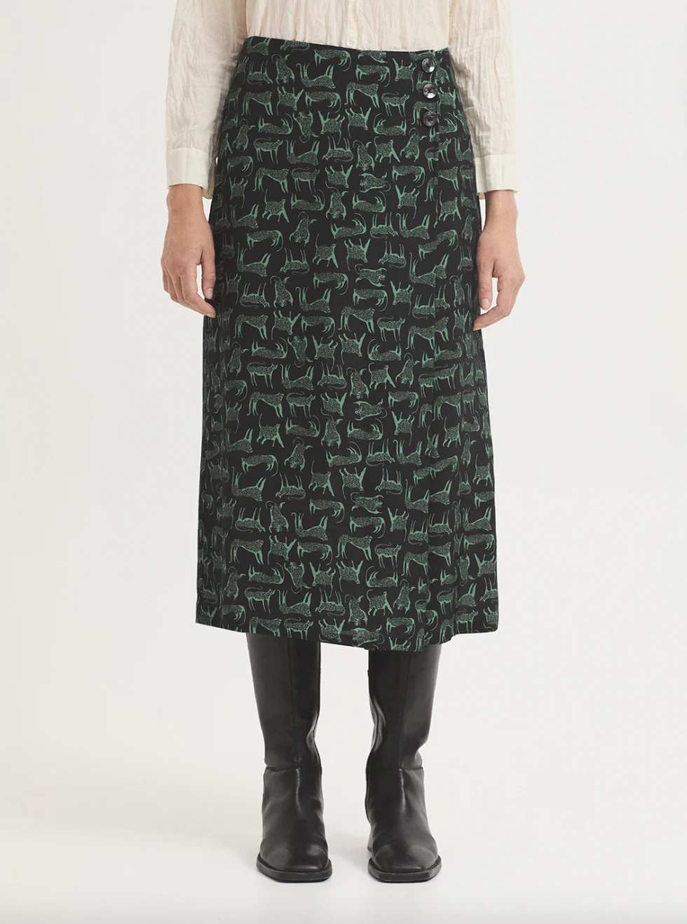 Falda cruzada en crepé de viscosa con estampado Feline. Cinturilla con botón interior y tres exteriores. Goma interior en la parte trasera de la cintura.