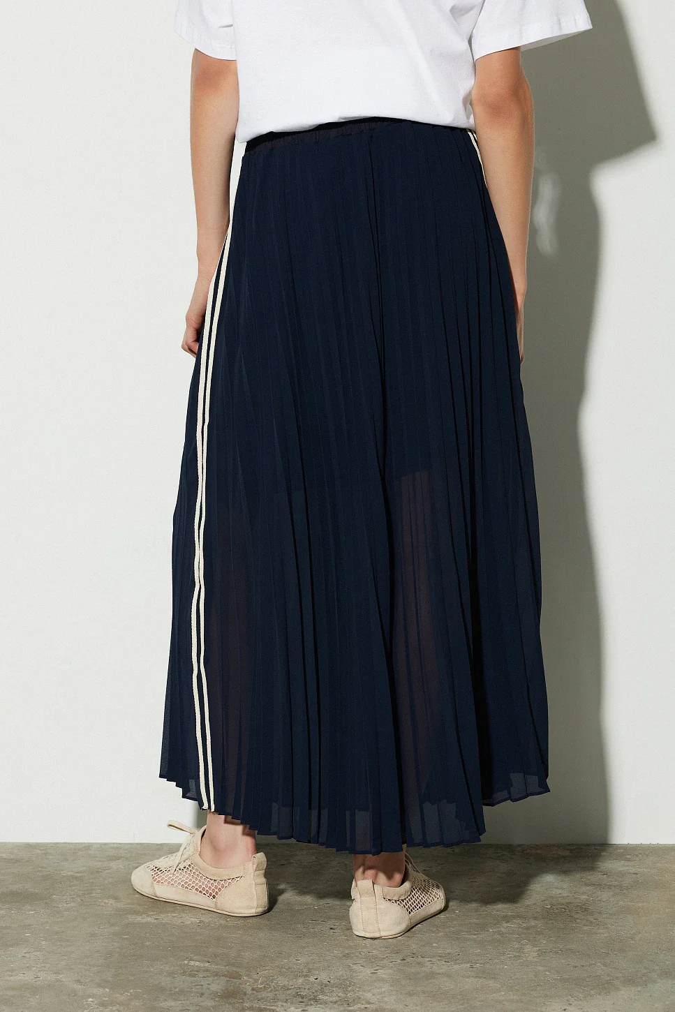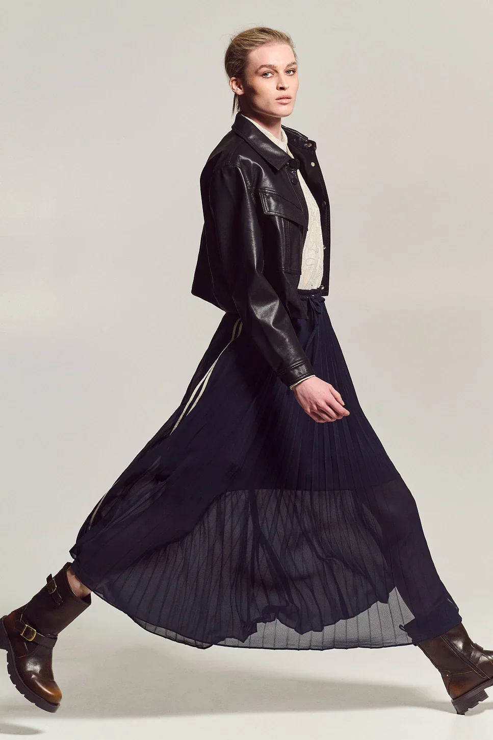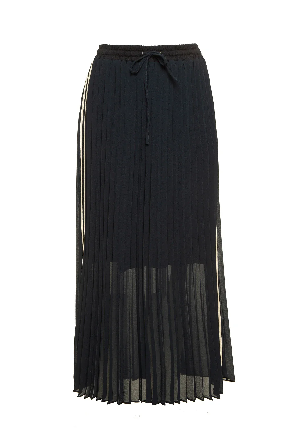 Falda larga plisada con cintura elástica, cierre con lazo en la cintura, con forro interior, semitransparente, corte regular.