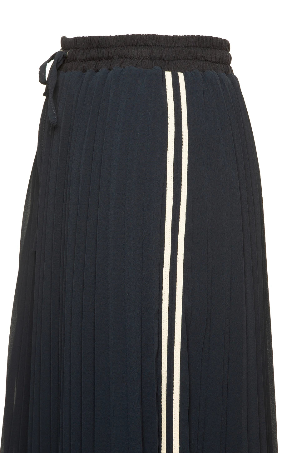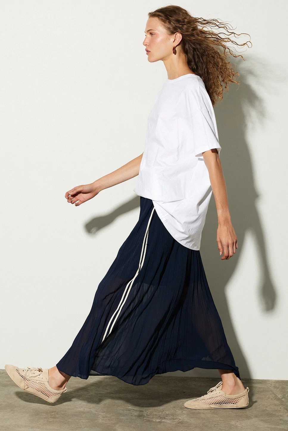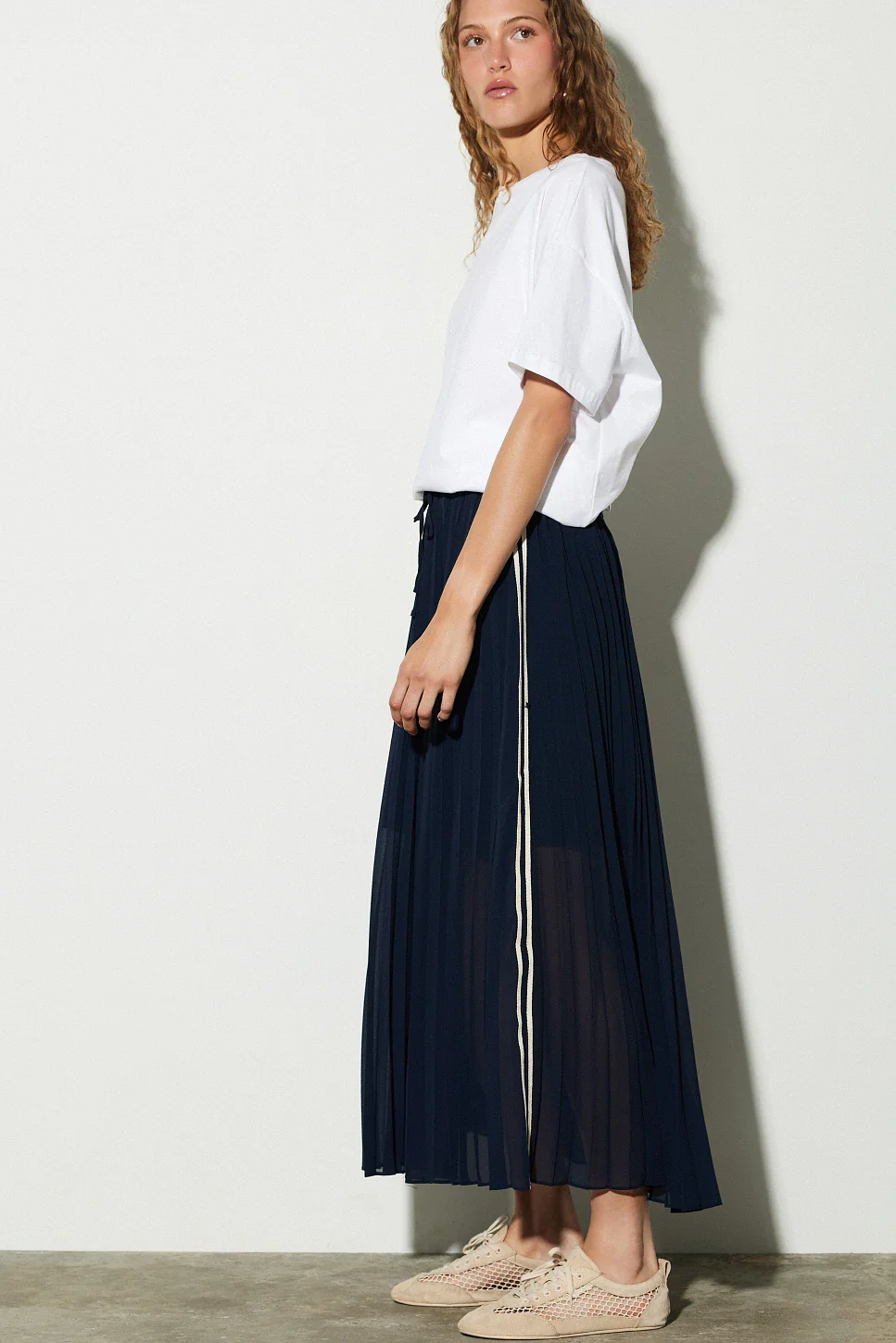 Falda larga plisada con cintura elástica, cierre con lazo en la cintura, con forro interior, semitransparente, corte regular.