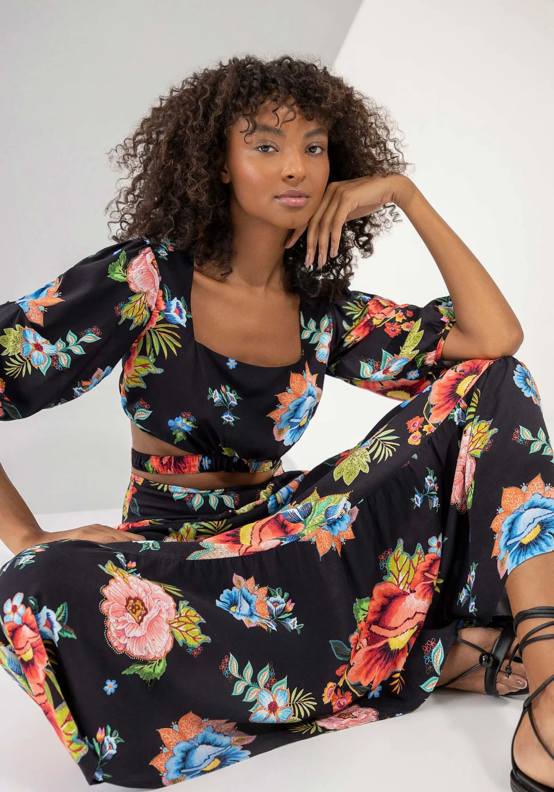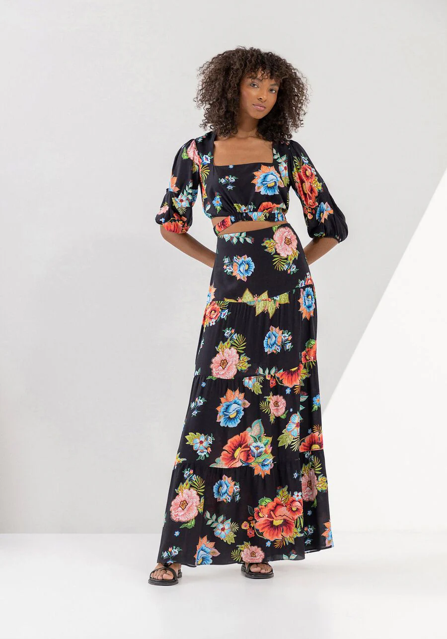 Falda midi en viscosa que, a través del diseño de volantes, proporciona un ajuste fluido con mucho movimiento.