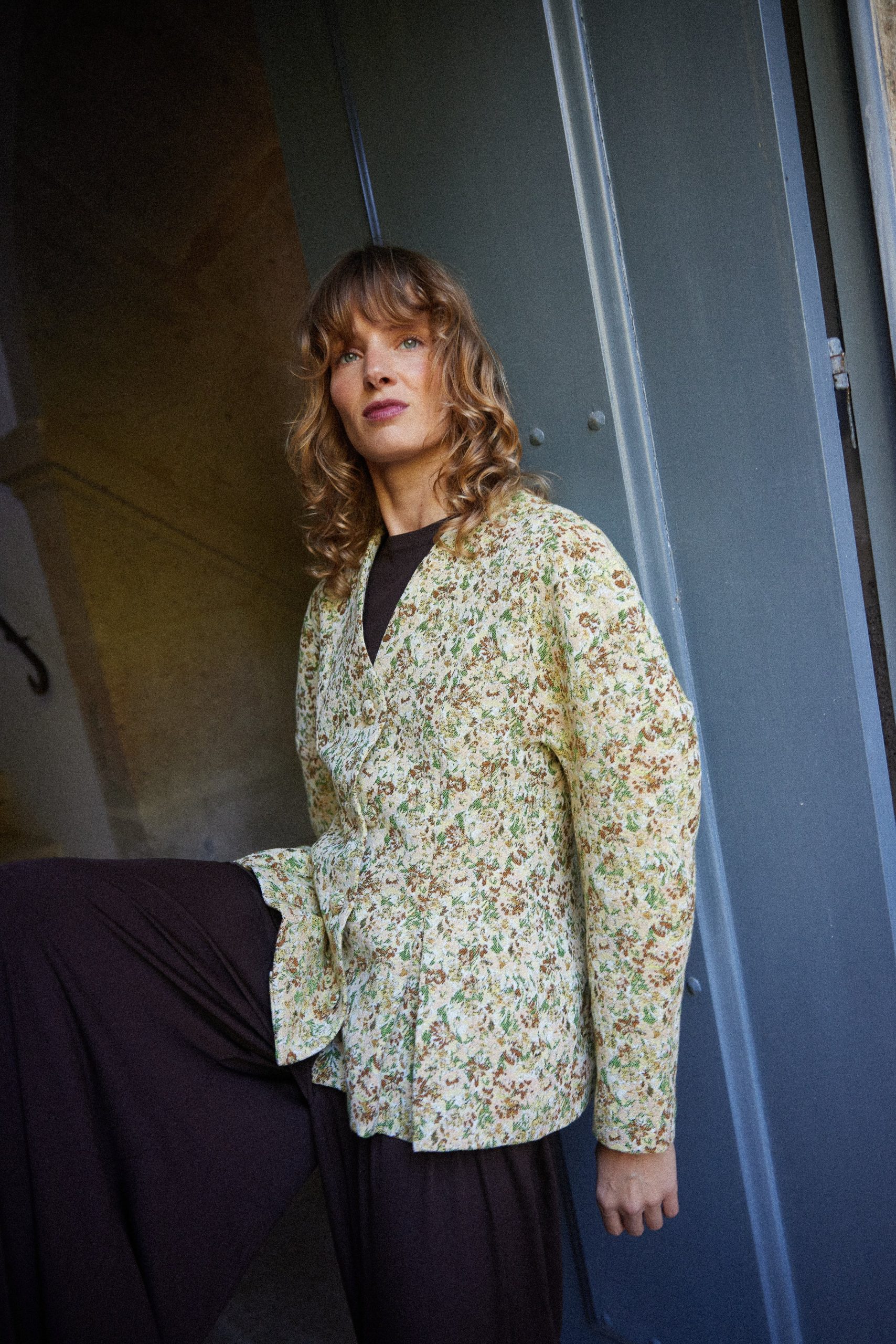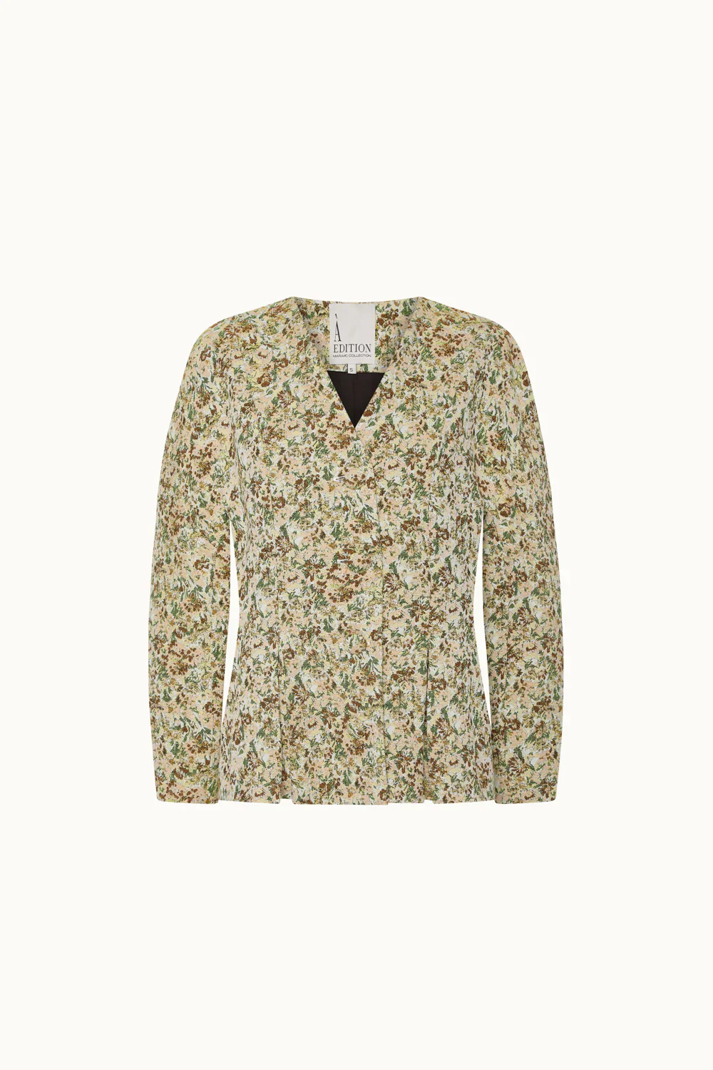 Blazer con estampado floral en beige. Forro interior de algodón. Destaca por sus botones forrados y bolsillos a los lados. Una pieza única que añade un toque especial y sofisticado a tu armario. Ideal para crear looks modernos y elegantes.