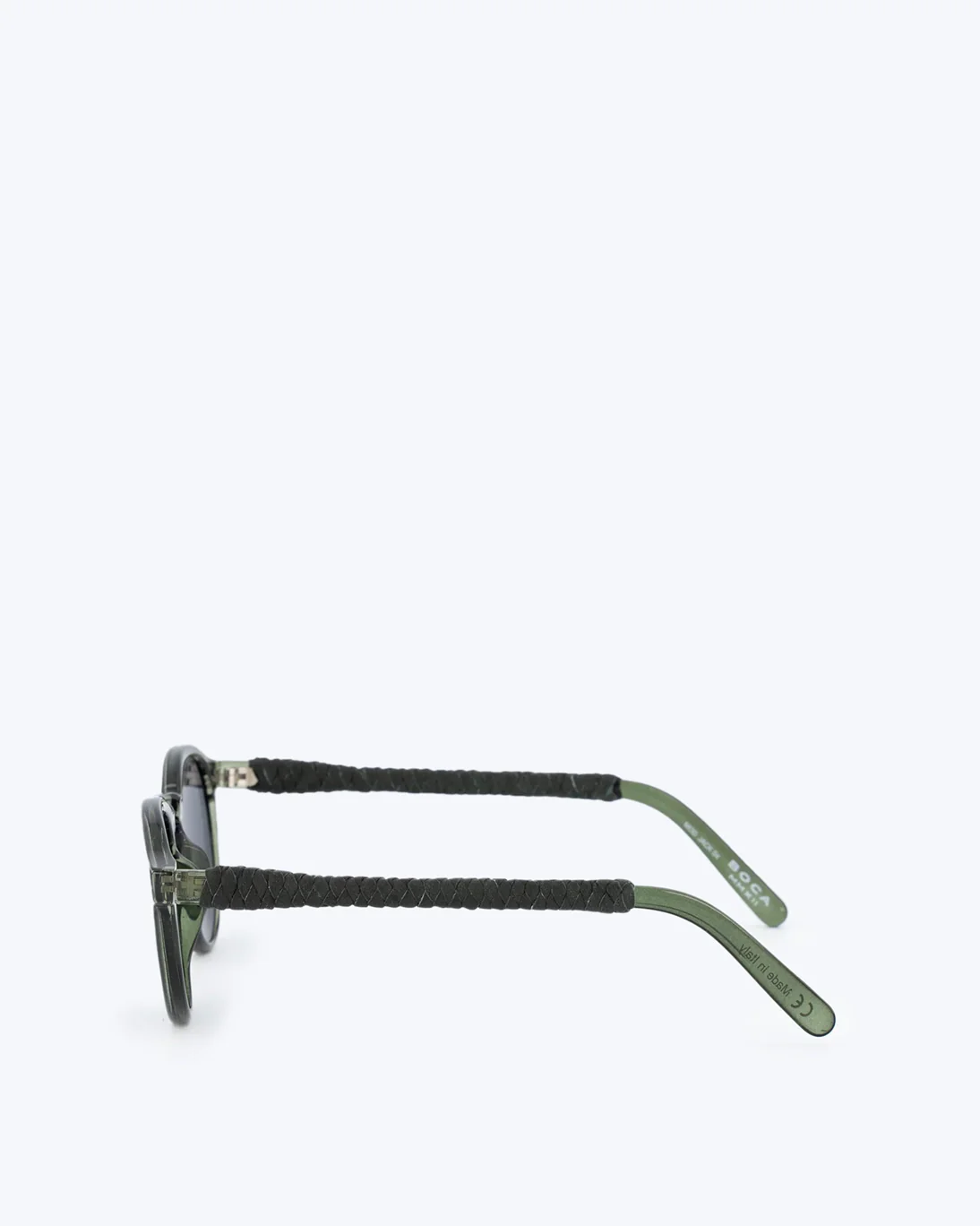 Gafas de sol de la marca Boca, fabricadas en Italia con montura suiza TR90 de satén azul marino ligera y duradera, con un elegante diseño de piel trenzada hecho en México con piel de oveja de primera calidad. Se completa con lentes grises que reducen la transmisión de la luz en un 75% y proporcionan una protección del 100% frente a los rayos UVA y UVB.
