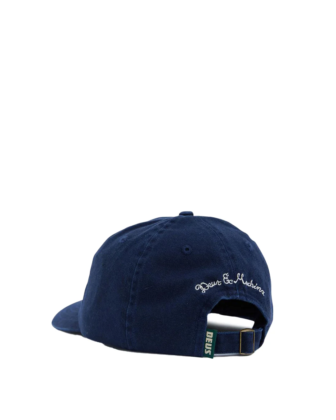 Gorra de la marca Deus, de color navy con decorado en la parte delantera y trasera.