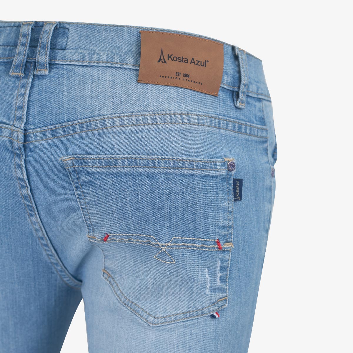 Este jean con silueta Custom está confeccionado en algodón con 2% de spandex, lo que le aporta un ajuste cómodo y ligeramente elástico para mayor libertad de movimiento. Su tono azul claro presenta un lavado suave con detalles de desgaste sutiles que realzan su estilo casual.
