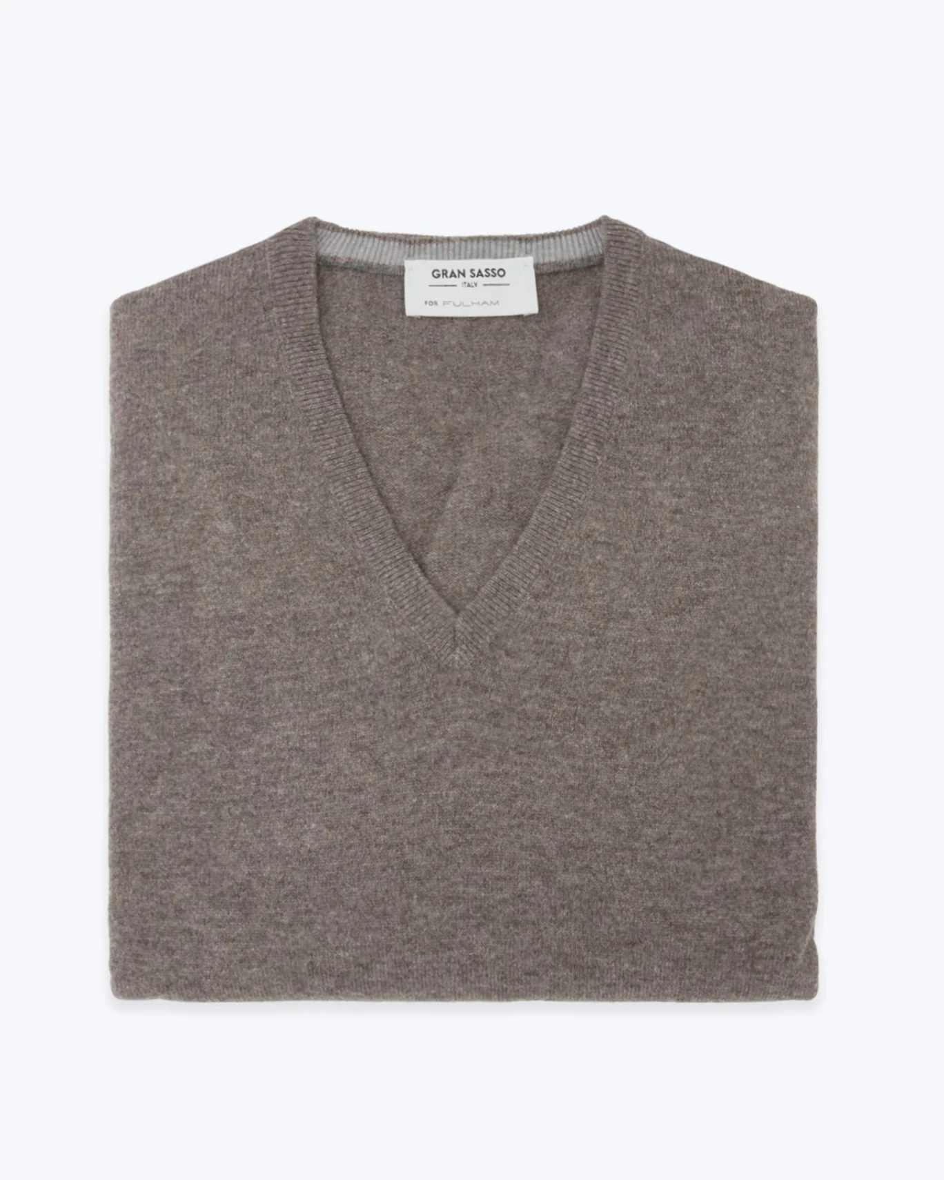 Jersey de pico, de la marca Gran Sasso, fabricado exclusivamente para Fulham, en color marrón claro. Con puño y bajo acanalados con un toque elástico.